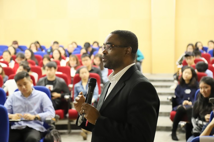 Acting Associate Dean of DBM, Dr Uchenna Eze, asks a question to Mr Yuan