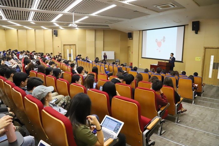 T29-106 was packed full of students eager to hear Mr Yuan speak about entrepreneurship, and his personal experience running his own business. He was introduced by the Dean of DBM, Prof Stella Cho, who spoke highly of the guest speaker, and presented him with a gift to thank him for coming to UIC to speak to the students.