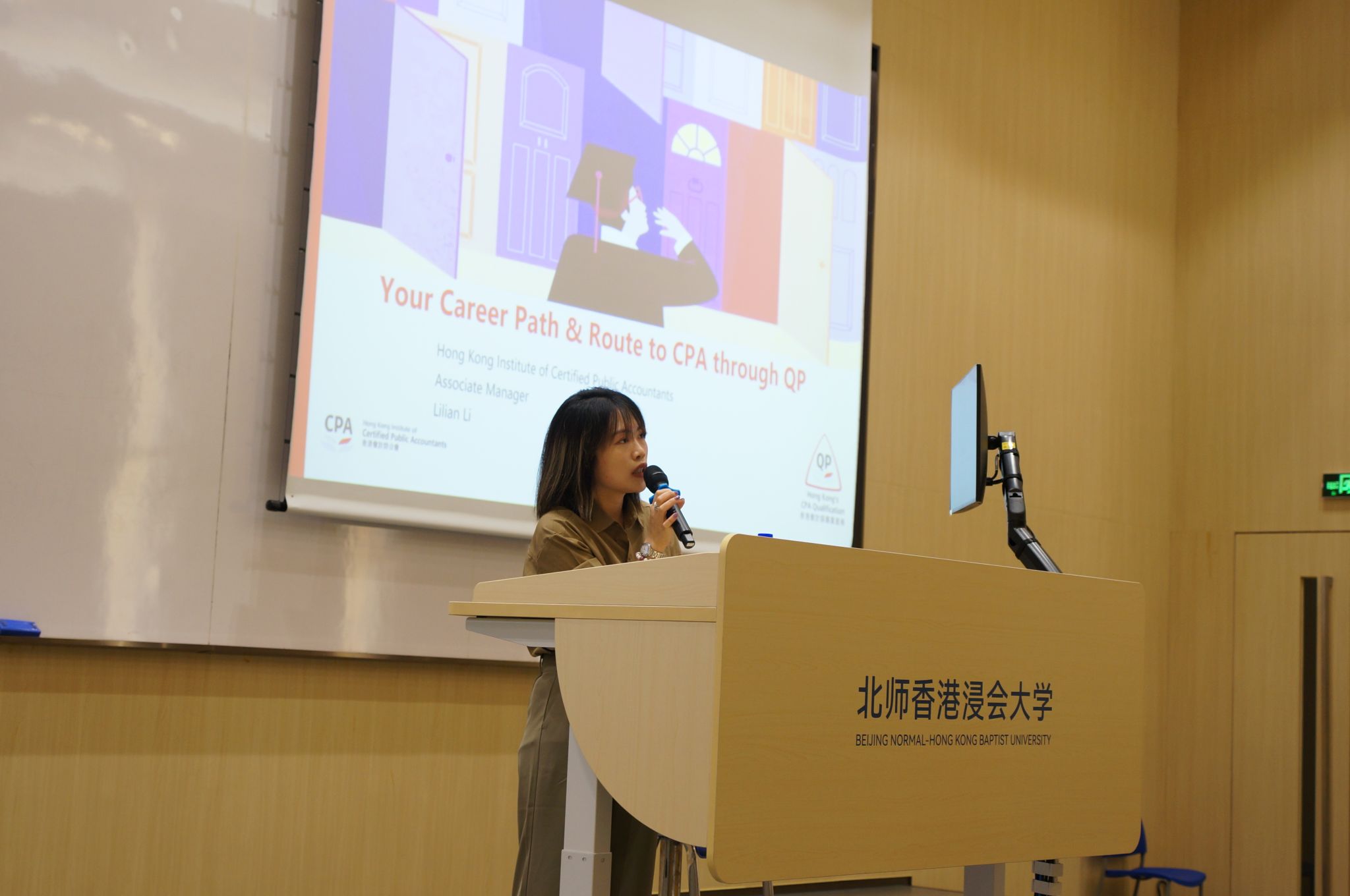On the evening of September 18, 2025, the Accounting Department of the Faculty of Business and Management (FBM) successfully hosted a seminar titled “HKICPA QP: Empowering BNBU Students on the Path to Accounting Excellence” in T2-101. The seminar, held from 7:00 PM to 9:00 PM, featured Ms. Ying Li, Assistant Manager for Mainland China Affairs at the Hong Kong Institute of Certified Public Accountants (HKICPA), as the keynote speaker. Ms. Li provided a comprehensive overview of career development opportunities for accounting students, the dynamics of Hong Kong's capital market, and the professional value of HKICPA certification.