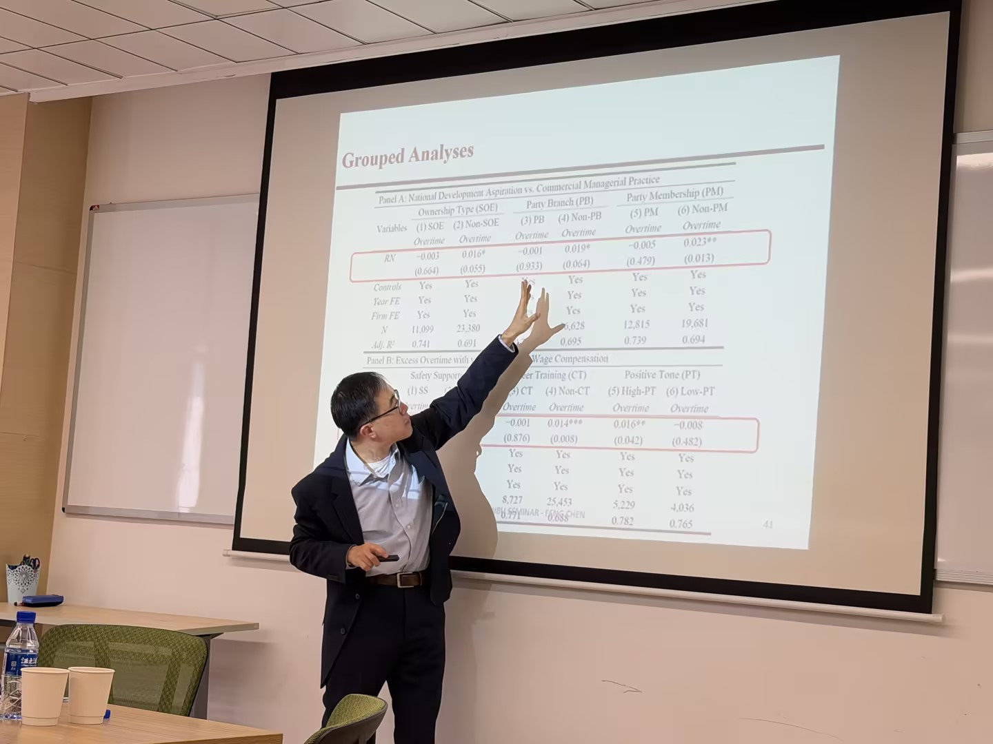 Dr. Feng Chen shared his latest research findings in the lecture, exploring how rhetorical nationalism affects employee behavior in firms, particularly in relation to overtime. The study focuses on three core questions: First, do firms with stronger nationalist rhetoric exhibit significantly higher levels of excess overtime? Second, does nationalist rhetoric intensify horizontal peer competition among employees while reducing vertical conflict? Third, who is most susceptible to ideological control?