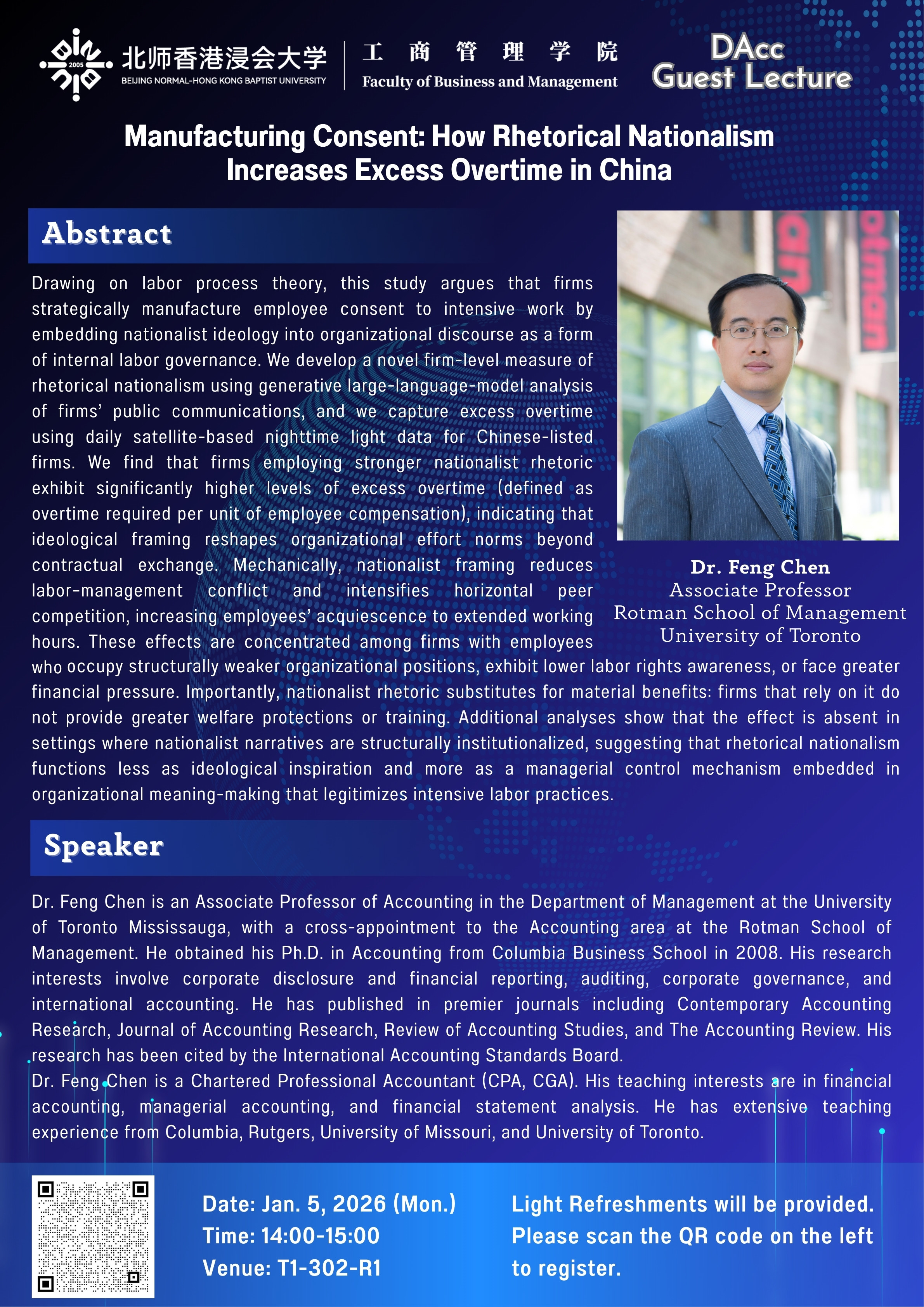 Dr.Feng Chen is an Associate Professor of Accounting in the Department of Management at the University of Toronto Mississauga, with a cross appointment to the Accounting area at the Rotman School of Management. He obtained his Ph.D. in Accounting from Columbia Business School in 2008. His research interests involve corporate disclosure and financial reporting, auditing, corporate governance, and international accounting. He has published in premier journals including Contemporary Accounting Research, Journal of Accounting Research, Review of Accounting Studies, and The Accounting Review. His research has been cited by the International Accounting Standards Board.