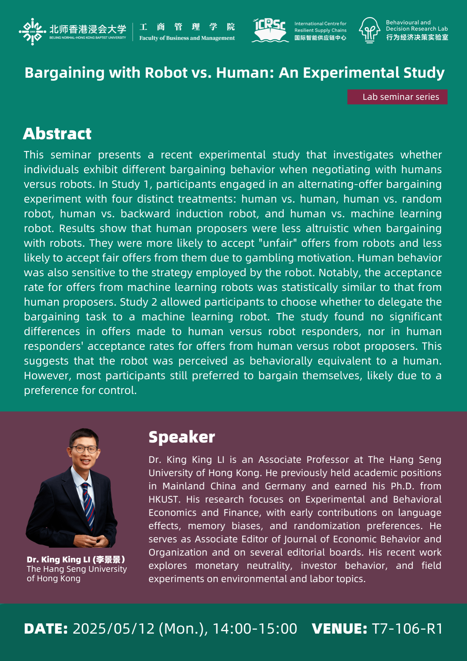 This seminar presents a recent experimental study that investigates whether individuals exhibit different bargaining behavior when negotiating with humans versus robots. In Study 1, participants engaged in an alternating-offer bargaining experiment with four distinct treatments: human vs. human, human vs. random robot, human vs. backward induction robot, and human vs. machine learning robot. Results show that human proposers were less altruistic when bargaining with robots. They were more likely to accept "unfair" offers from robots and less likely to accept fair offers from them due to gambling motivation. Human behavior was also sensitive to the strategy employed by the robot. Notably, the acceptance rate for offers from machine learning robots was statistically similar to that from human proposers. Study 2 allowed participants to choose whether to delegate the bargaining task to a machine learning robot. The study found no significant differences in offers made to human versus robot responders, nor in human responders' acceptance rates for offers from human versus robot proposers. This suggests that the robot was perceived as behaviorally equivalent to a human. However, most participants still preferred to bargain themselves, likely due to a preference for control.
