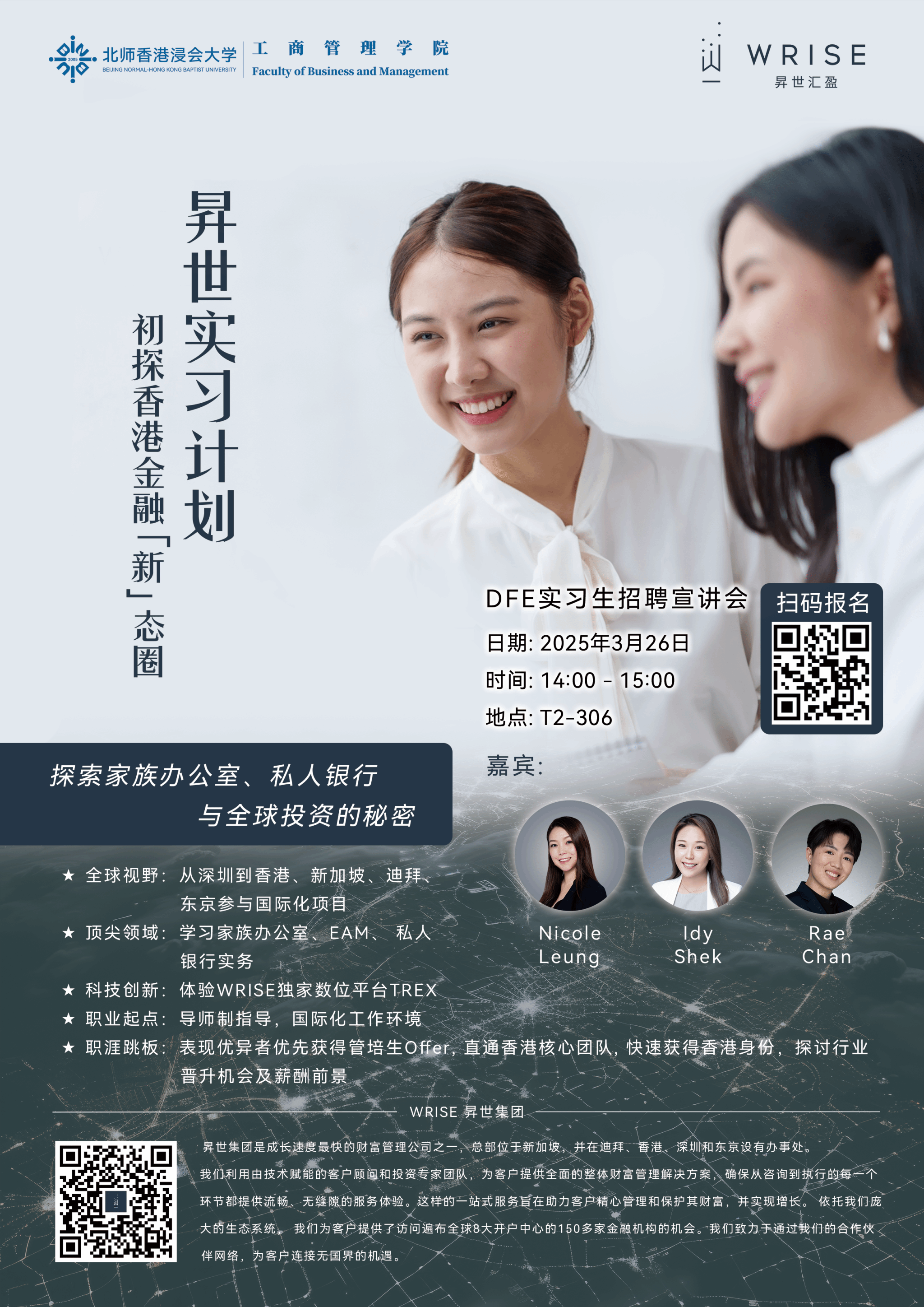 欢迎对金融、财富管理、国际业务感兴趣的同学前来参加宣讲会。有意申请的同学可扫描海报二维码提交英文CV,如想即场报名,亦可当日到场提交CV。