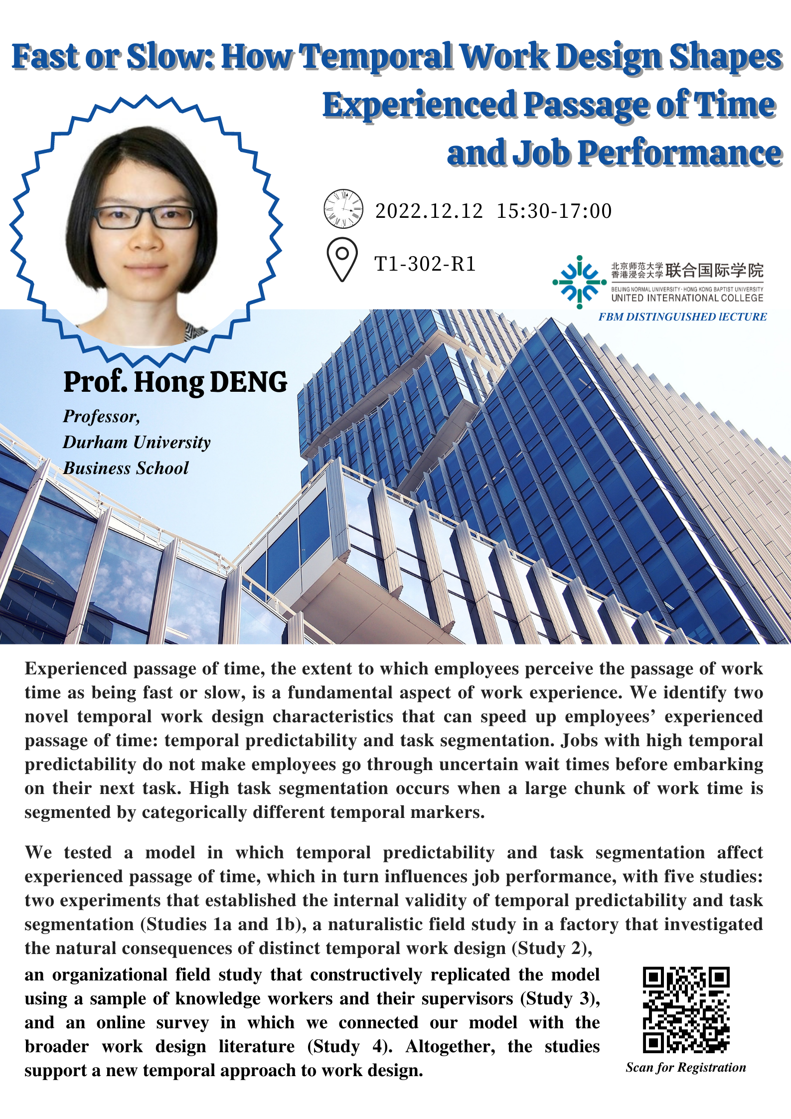 Hong Deng is a professor at Durham University Business School. Her research interests include self-regulation at work, organizational justice, person-organization-job fit, and work design. Hong’s work has been published at leading academic journals in the field such as at Academy of Management Journal, Journal of Applied Psychology, Personnel Psychological, and Journal of Management. She is an incoming associate editor for Personnel Psychology.