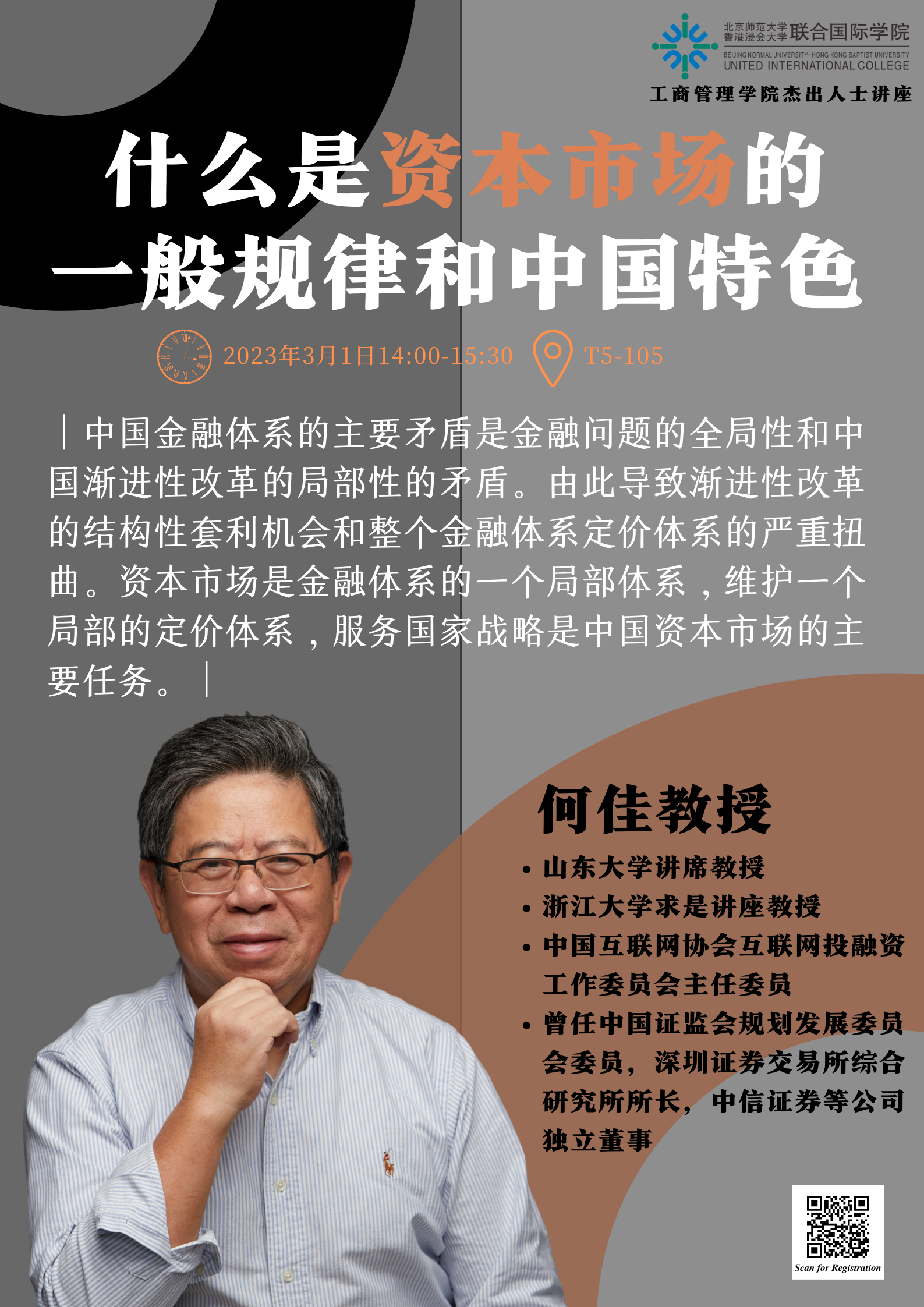 Prof. He received his PhD in Finance from Wharton School in 1988. He is currently Chair Professor at Shandong University, Qiushi Chair Professor at Zhejiang University, and the Chairman of the Investment and Financing Working Committee of the Internet Society of China. He was a member of the Planning and Development Committee of the China Securities Regulatory Commission, Director of the Shenzhen Stock Exchange General Research Institute, and an independent director of CITIC Securities and other companies. He has published many papers in Journal of Finance, Journal of Business, Journal of International Business Studies, etc., and published a monograph "On the Main Contradictions and Stable Development of China's Financial System".