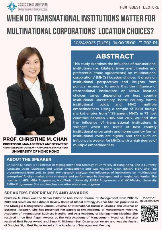 Christine M. Chan is a Professor of Management and Strategy at University of Hong Kong. She is currently Associate Dean (Outreach and Global Engagement) and was Assistant Dean (EMBA, MBA, and Tpg programmes) from 2013 to 2018. Her research analyzes the influences of institutions on multinational enterprises’ foreign market entry strategies and performance in developed and emerging economies. She teaches in HKU MBA Programme, HKU/Fudan University EMBA Programme and HKU/Peking University EMBA Programme. She also teaches executive education programs.
