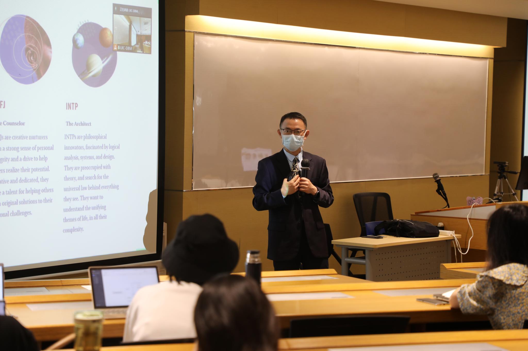In the first part of the lecture, Dr. Liu introduced in detail the MBTI Personality Test, a very popular personality categorizing system recently. The test is a theoretical model of personality types developed by American writer Isabel Briggs Myers and Katharine Briggs. It measures people's preferences according to Myers and Briggs' four personality type dimensions to help people discover their strengths and better understand what makes people different. The test defined 16 personality types on four dimensions: Introversion vs. Extraversion, Sensing vs. Intuition, Thinking vs. Feeling, Judging vs. Perceiving. After a brief introduction of the 16 personality types, Liu also shared the results of his own test, and explained the correlation between his career choice and personality type in detail.