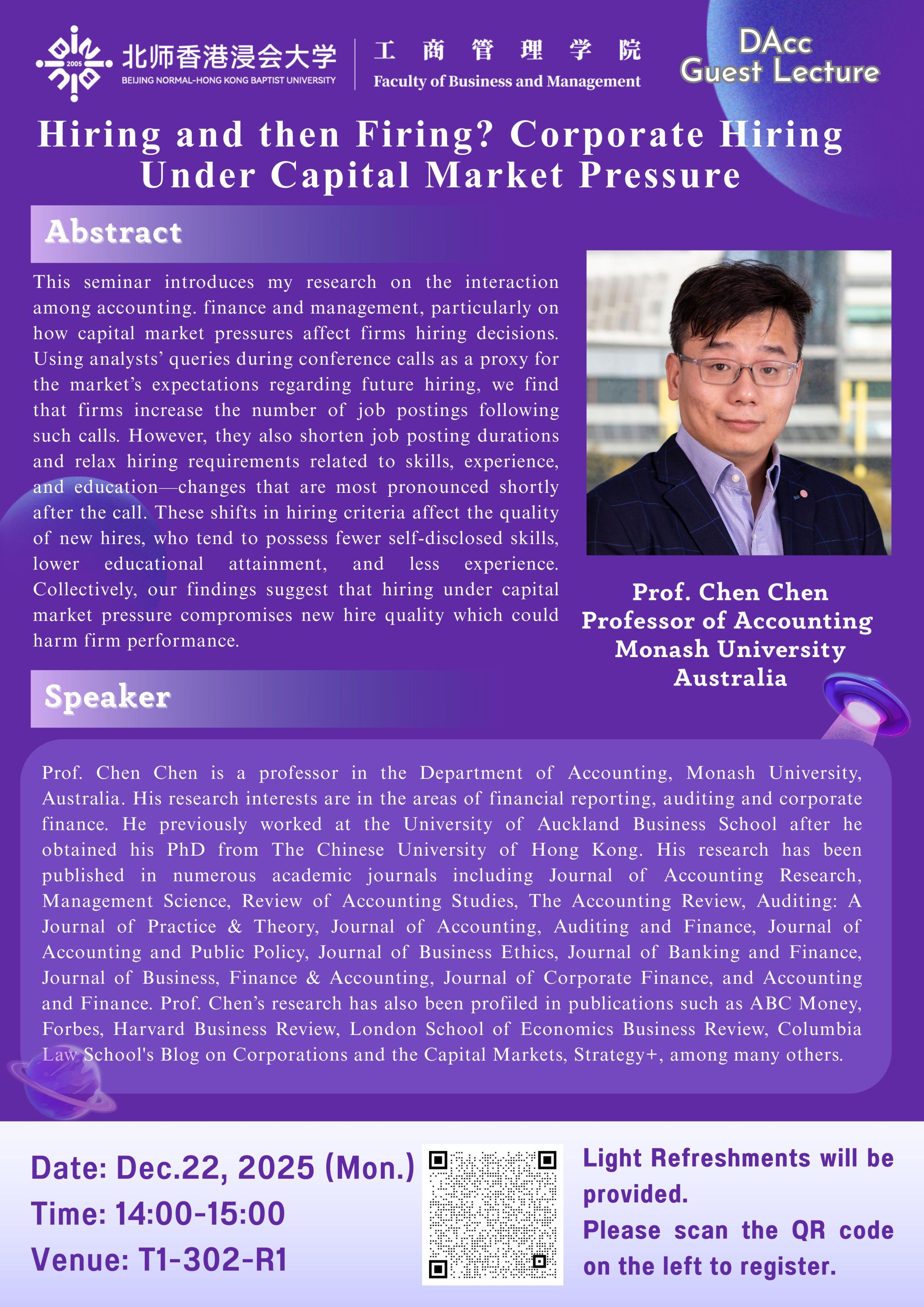 This seminar introduces my research on the interaction among accounting. finance and management, particularly on how capital market pressures affect firms hiring decisions. Using analysts’ queries during conference calls as a proxy for the market’s expectations regarding future hiring, we find that firms increase the number of job postings following such calls. However, they also shorten job posting durations and relax hiring requirements related to skills, experience, and education—changes that are most pronounced shortly after the call. These shifts in hiring criteria affect the quality of new hires, who tend to possess fewer self-disclosed skills, lower educational attainment, and less experience. Collectively, our findings suggest that hiring under capital market pressure compromises new hire quality which could harm firm performance.