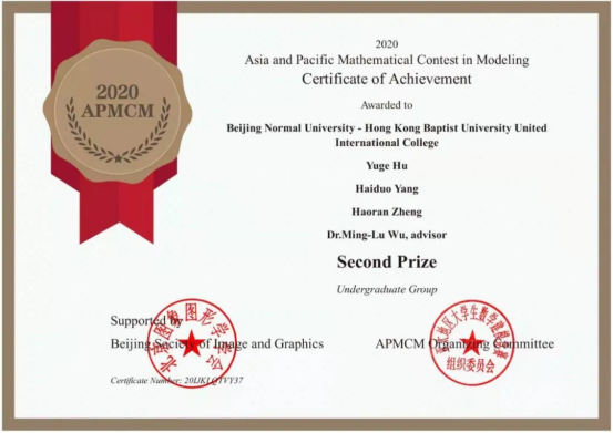A team composed of three students from the Division of Business and Management (DBM) at UIC won the second prize at the 2020 Asia and Pacific Mathematical Contest in Modelling (APMCM).The 2020 Asia and Pacific Mathematical Contest in Modelling attracted ma...