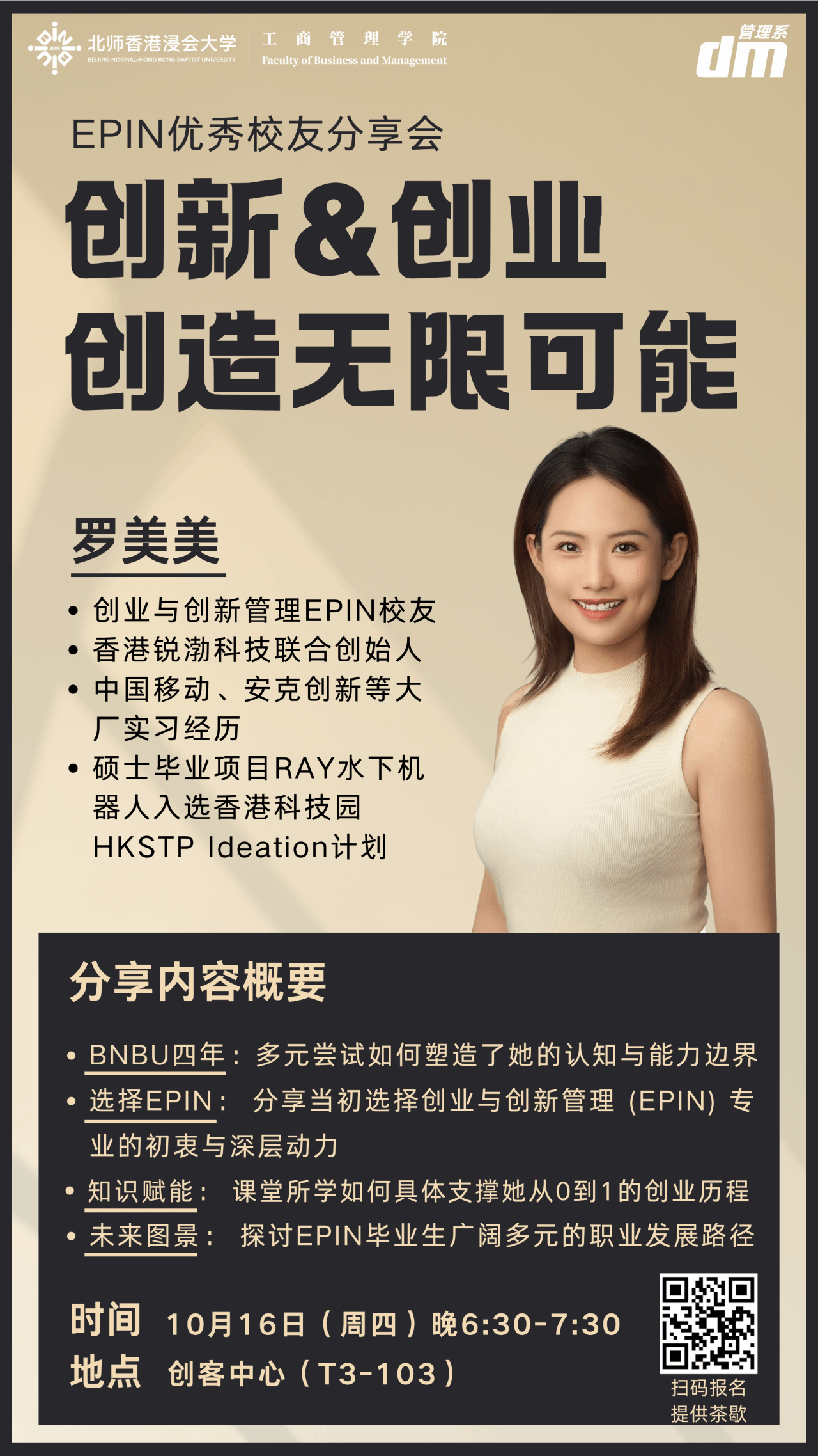 10月16日,工商管理学院管理系“优秀校友分享会”系列,邀请到刚毕业便已在创业前沿崭露头角的罗美美校友。她将带着在BNBU积攒的宝贵经历与走出校门后的实战成果,重返母校,与学弟学妹们进行一场真诚而深入的对话,为你展现一条从校园思考到市场创造的鲜活路径。