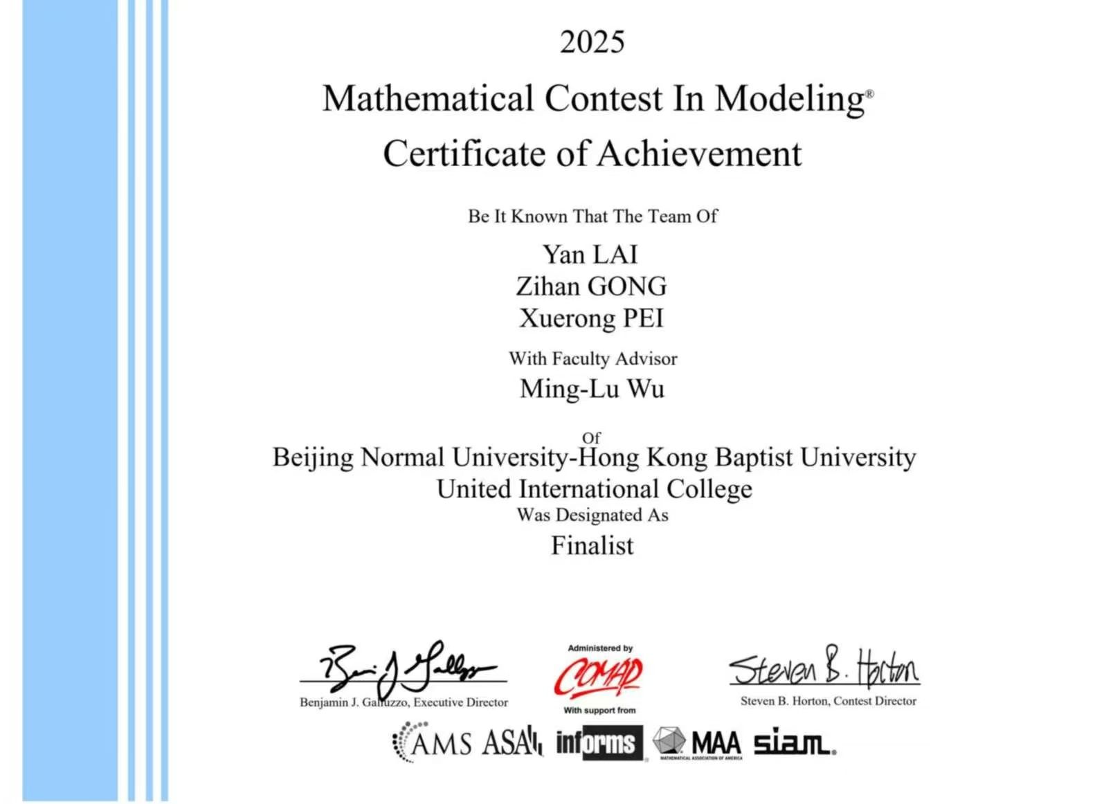 作为金融经济系的老师,我一直教授定量分析方面的课程,包括计量经济、数理经济、商业预测、金融微积分和线性代数等,也一直重视学生们数学建模的能力,特别是通过数学建模解决经济、金融问题的能力,而引领同学们参加高水平的数学建模竞赛是训练他们的这些能力的一个重要的、有效的方法。美国大学生数学建模竞赛是类似竞赛中历史最久、水平最高和最具影响力的一个竞赛,每年全球有数万支学生队伍踊跃参赛,而最终只有不超过2%的队伍能获得特等奖提名(即成为Finalist)。