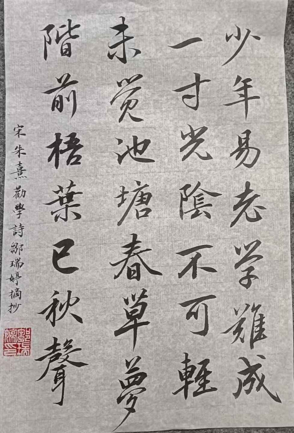 这种强烈的反差,在邹瑞婷看来是一种互补。练习书法时培养的专注力让她在分析数据时更加细致入微;而读诗词、跨越时空与古人对话,则为她带来了缓解压力的慰藉。她提到,“大学不应只局限于学习,培养一些爱好是很有必要的。”每当结束一天的学习后,提笔练字总能让她找到内心的平静。