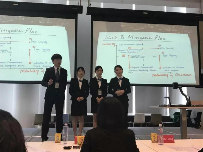 4月22日的比赛分两轮进行。上午为第一轮淘汰赛,下午为第二轮决赛。参赛队伍在每轮比赛中现场获得未经公开发表的商业案例,在独立封闭的讨论室内进行案例分析,并在规定时间内提出针对案例问题的解决方案,其后由评委对所有参赛队伍的表现进行反馈和点评。大赛的设计非常考验学生的知识、分析、英语表达等综合能力。UIC的参赛团队通过了首轮比赛,并在决赛中获得季军。
