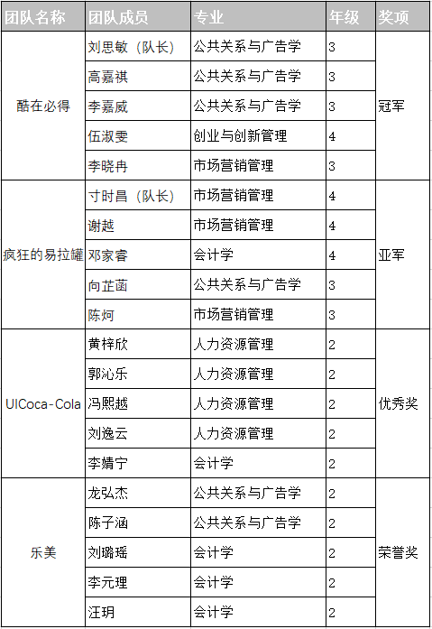 亚军队伍:团队“疯狂的易拉罐” 很开心能够在本次可口可乐杯中获得亚军,但比起比赛结果,对他们而言更重要的收获是在整个赛程中小组成员的协作与磨合,大家一起在阅读周留在校园布局实战环节,将营销的策划一步步落到实处。他们感谢给予他们支持的每一位老师及每一个组织,每一位参与的同学和最棒的决赛亲友团。尽管压力与紧张会伴随商赛的过程,但思维的碰撞、思考与成长以及结果的喜悦都是更为珍贵的体验。