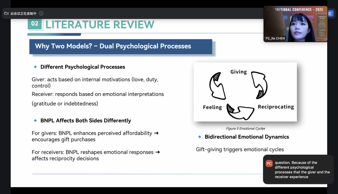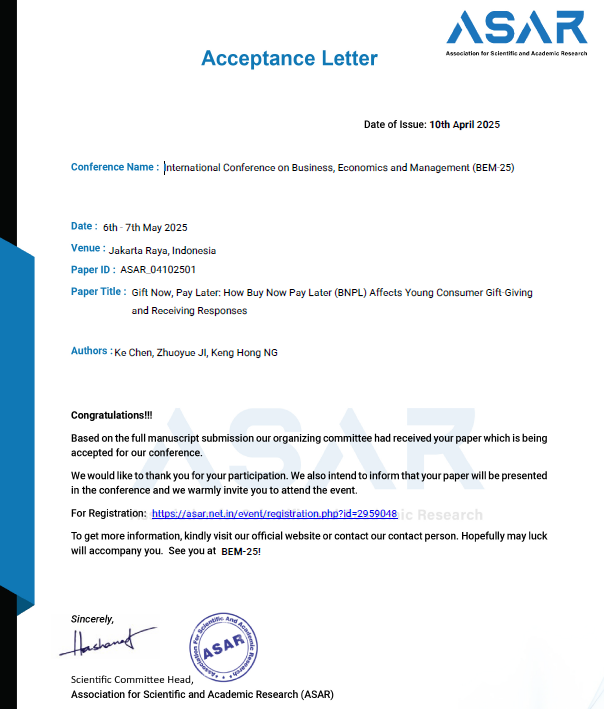 陈炣、纪卓越(市场营销管理2025届毕业生)与黄庆丰博士合作发表会议论文,上图为商业、经济与管理国际会议 (BEM - 25) 论文接收函与会议邀请函,以及陈炣在该会议作学术报告