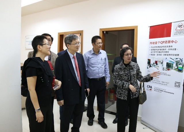 在学生文化小镇皮影戏馆里,来宾观看学生制作的皮影创意作品后,他们大赞有趣并拍照留念;在左龙佩兰院长的带领和介绍下,来宾们还去到小镇四栋,参观了内地首家QP(香港会计师公会专业资格课程)资源中心。