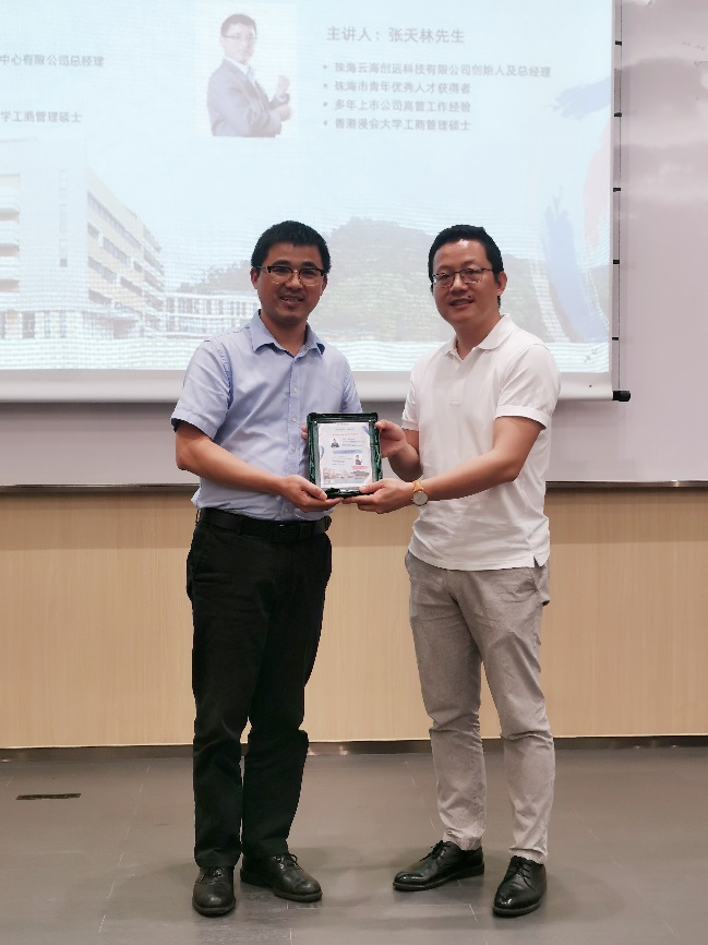 工商管理学部助理院长翁祉泉博士致欢迎辞,并向两位演讲嘉宾赠送纪念品。张天林先生和辛占华博士均在UIC完成了香港浸会大学MBA,在创业创新领域拥有丰富的经验。