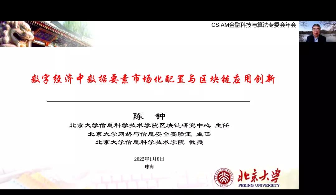 在大会主旨报告环节,北京大学信息科学技术学院区块链研究中心主任、UIC-链飞区块链研究中心首席科学家陈钟教授,作为中国工业与应用数学学会金融科技与算法专业委员会(筹)的首届主任,作了议题为“数字经济中数据要素市场化配置与区块链应用创新”的主旨报告。