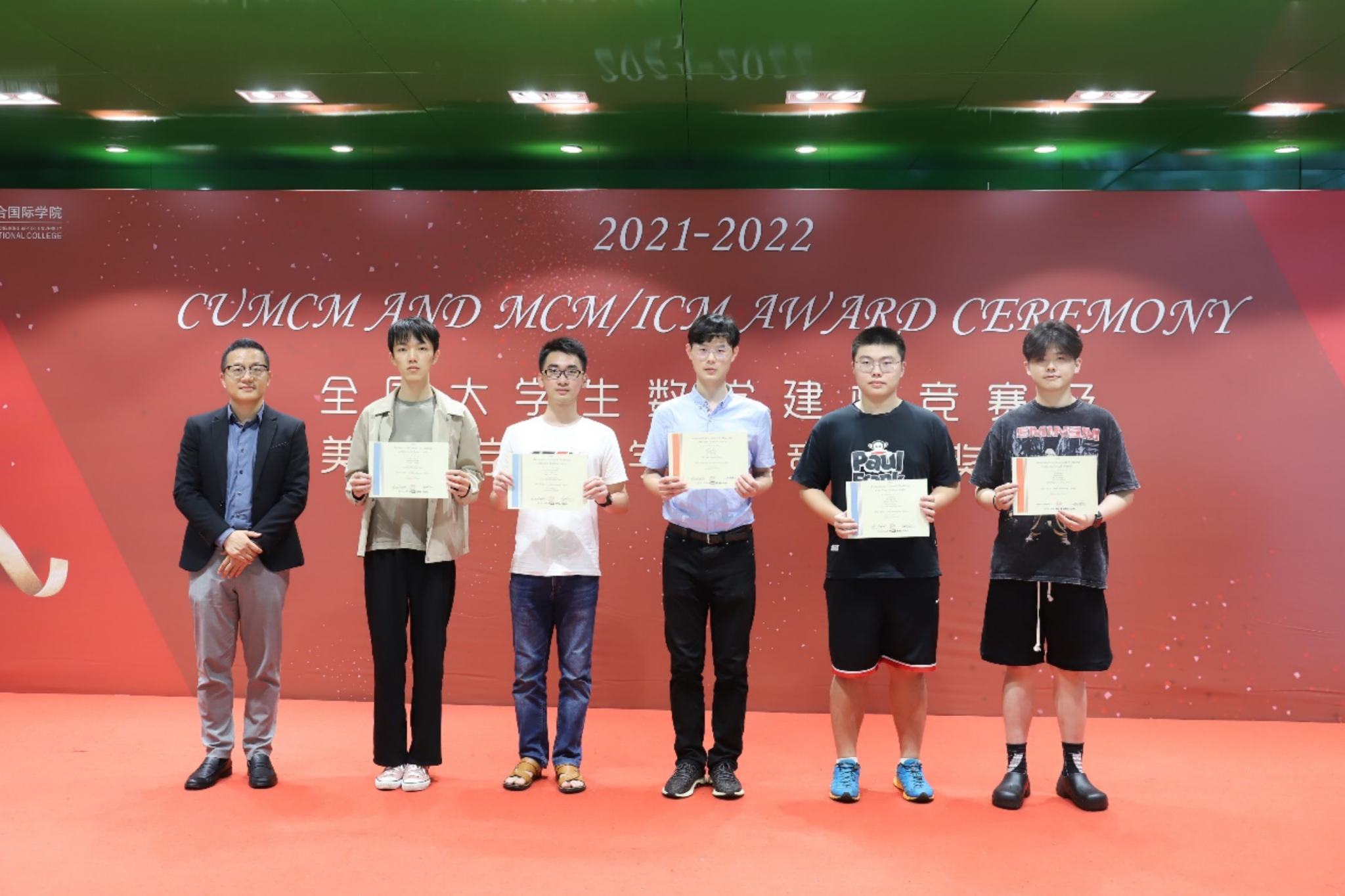 翁祉泉博士(左一)为美国大学生数学建模竞赛一等奖获奖同学代表颁奖