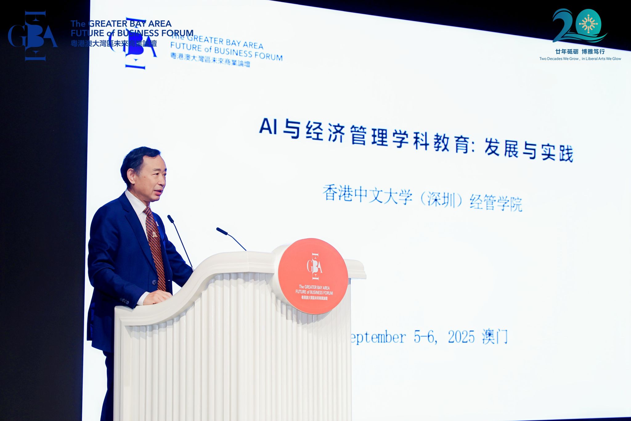 2025年9月5日至6日,首届“粤港澳大湾区未来商业论坛”(以下简称“论坛”)在澳门举行,一场尝试回应追问的深度对话就此展开。逾三百名学者、专家、行业代表与高校师生汇聚于此,通过主旨演讲、专题探讨、圆桌对话等多元形式,探讨人工智能浪潮下的商业变革、教育转型与职业形态重构等前沿问题。