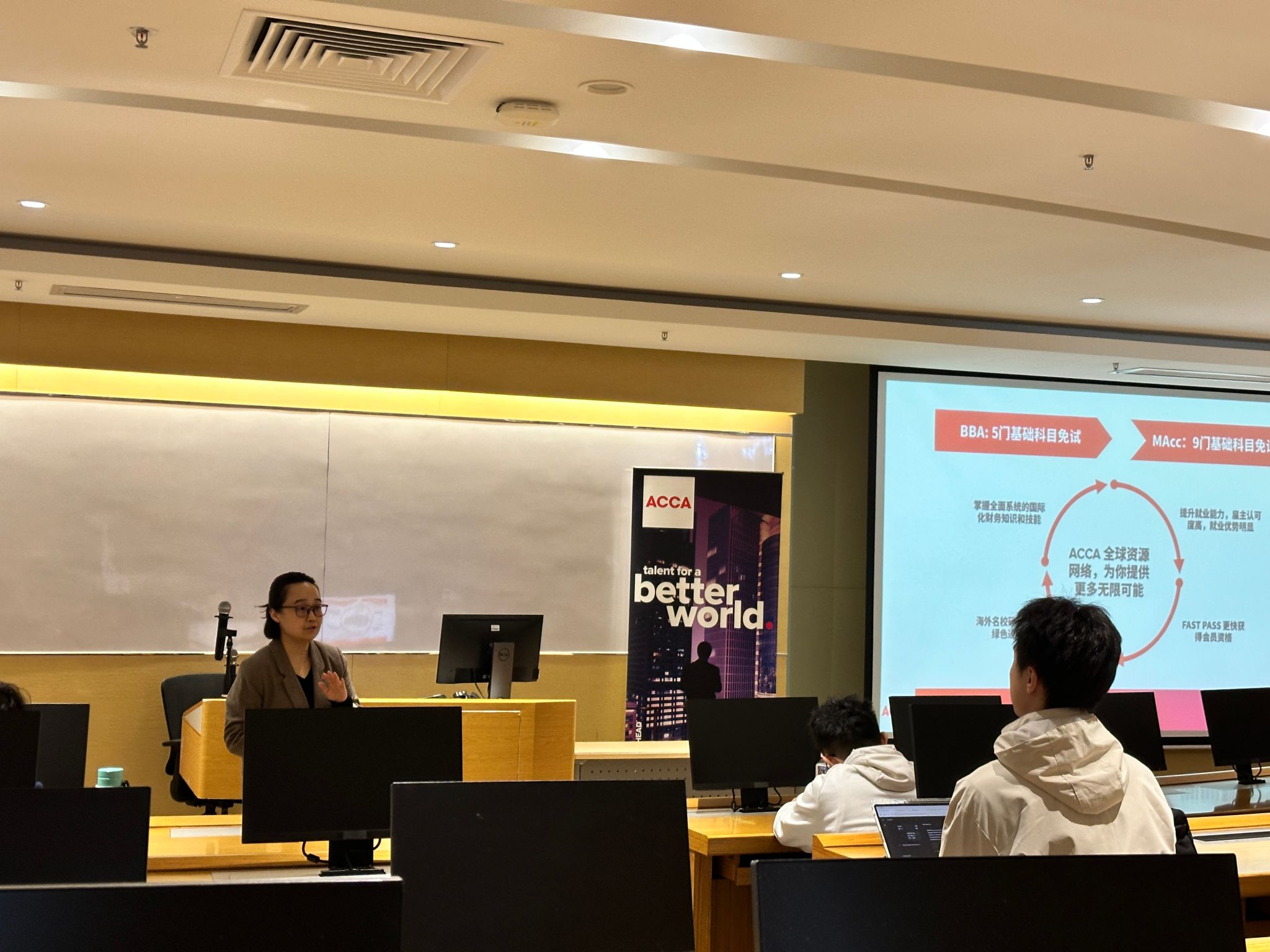 讲座最后,来自 ACCA华南教育关系主任吴敏航女士介绍了 ACCA 的全球化背景与专业价值。ACCA 目前在 180 多个国家和地区拥有会员及学员,与全球四大会计师事务所、大型跨国企业、金融机构深度合作,是国际财务人才最具认可度的资格之一。吴女士也向同学们解读了免试政策及学习路径,帮助大家更清晰地规划未来专业发展。