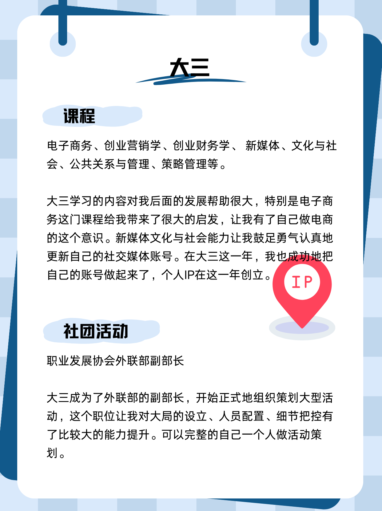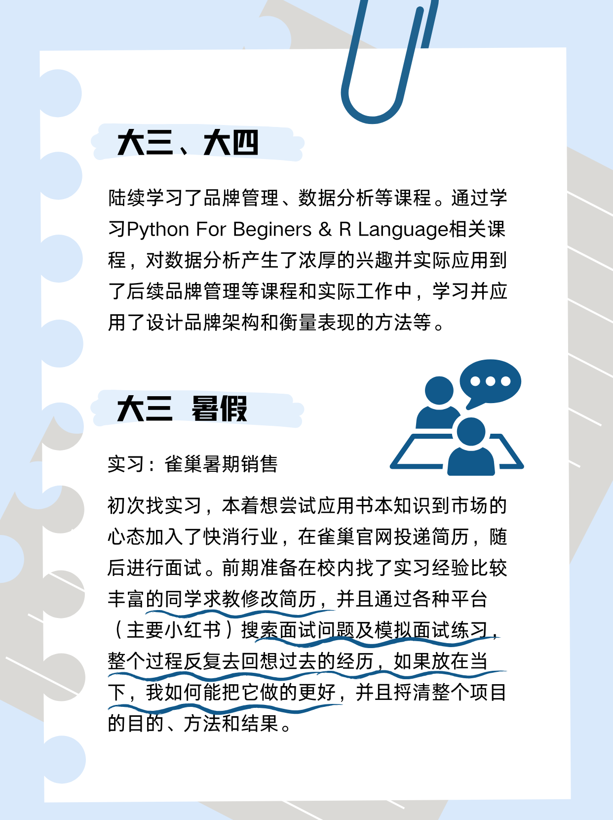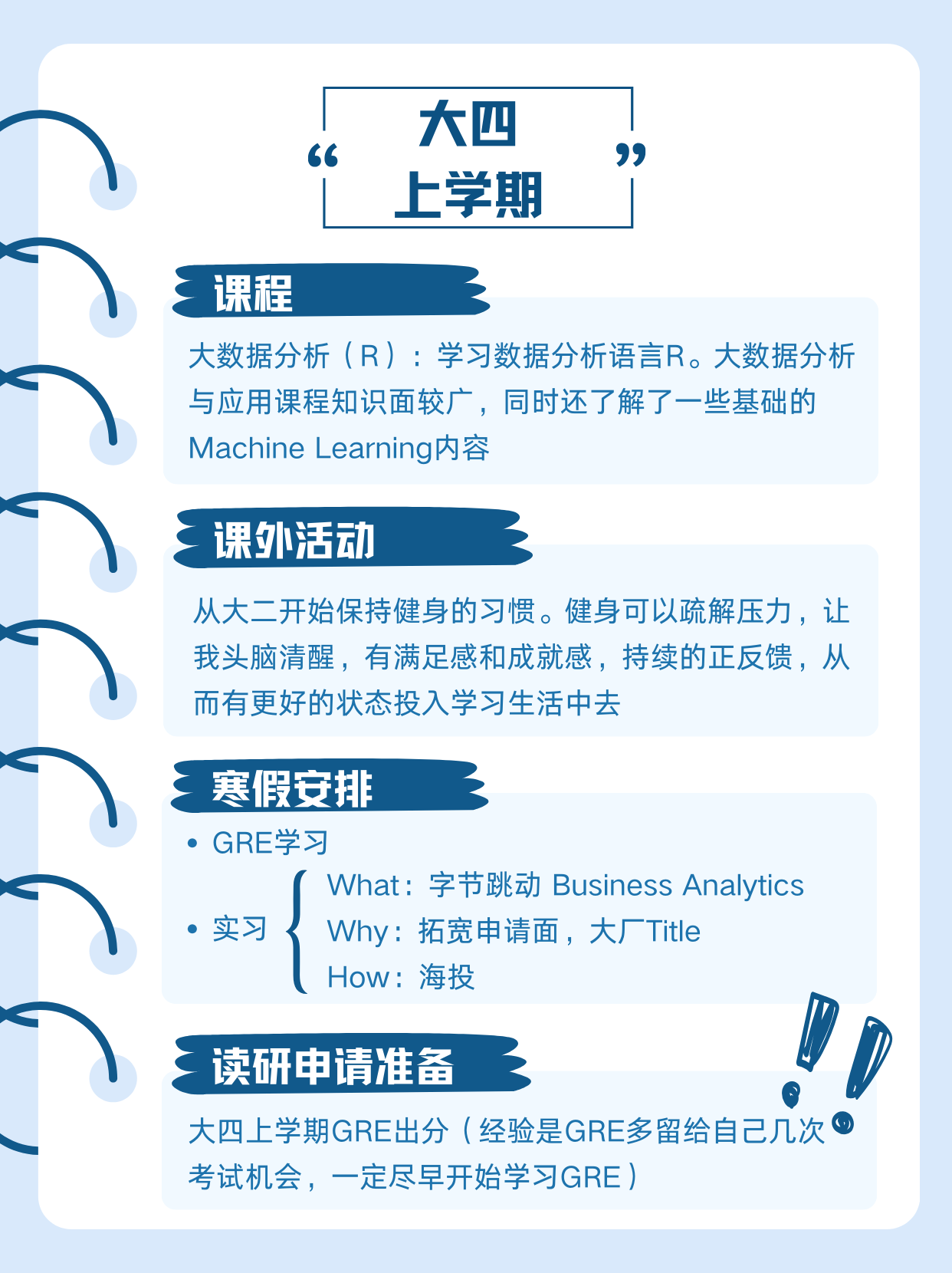 下面是四位来自管理系不同专业的毕业生,他们分别从各自的发展轨迹——读研、读博、就业以及创业的角度,回顾并梳理了自己的大学生活、重要的时间节点以及规划安排。诚然每个人的人生都无法简单地复制粘贴,但它山之石可攻玉,学长学姐走过的路也许可以为你的大学生涯提供一丝借鉴和启发。