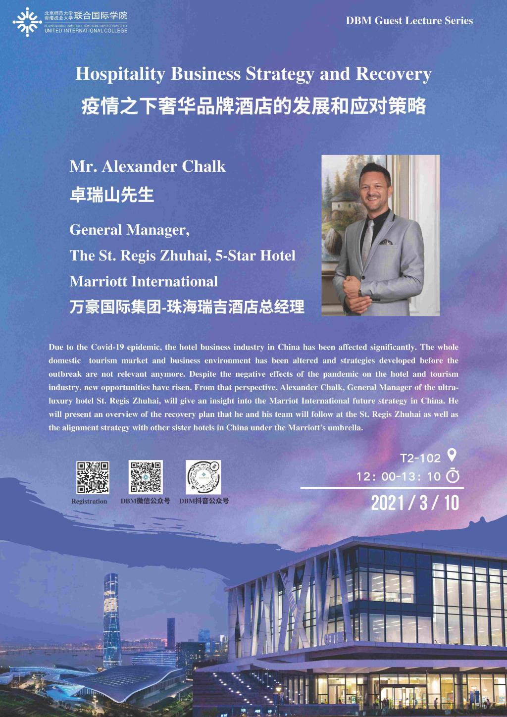 Due to the Covid-19 epidemic, the hotel business industry in China has been affected significantly. The whole domestic tourism market and business environment has been altered and strategies developed before the outbreak are not relevant anymore. Despite the negative effects of the pandemic on the hotel and tourism industry, new opportunities have risen. From that perspective, Alexander Chalk, General Manager of the ultra-luxury hotel St. Regis Zhuhai, will give an insight into the Marriot International future strategy in China. He will present an overview of the recovery plan that he and his team will follow at the St Regis Zhuhai as well as the alignment strategy with other sister hotels in China under the Marriott`s umbrella.