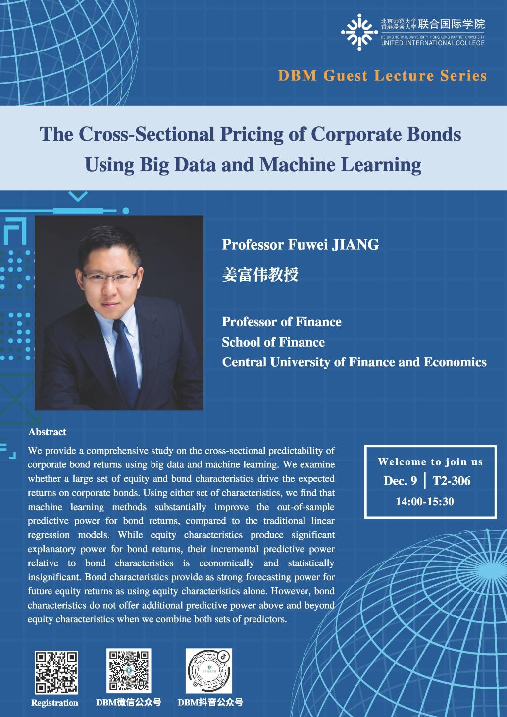 姜富伟教授现任中央财经大学金融工程系主任,教授、博导、龙马青年学者,研究领域包括资产定价、行为金融、金融科技、国际金融等,在金融学国际国内顶级期刊Journal of Financial Economics、Review of Financial Studies、《金融研究》、《管理科学学报》等发表论文30余篇,主持北京市和国家自然科学基金项目4项。研究成果被ESI评为经济管理类全球前1%最高被引用论文,被《哈佛商业评论》、《清华金融评论》等转载,荣获亚洲金融协会最佳论文奖、国际财务管理协会最佳论文奖等众多国际学术奖励荣誉。担任国家自然科学基金通讯评审、教育部学位中心评审专家、英文SSCI来源期刊Annals of Economics and Finance编委和30多本中英文学术期刊评审。