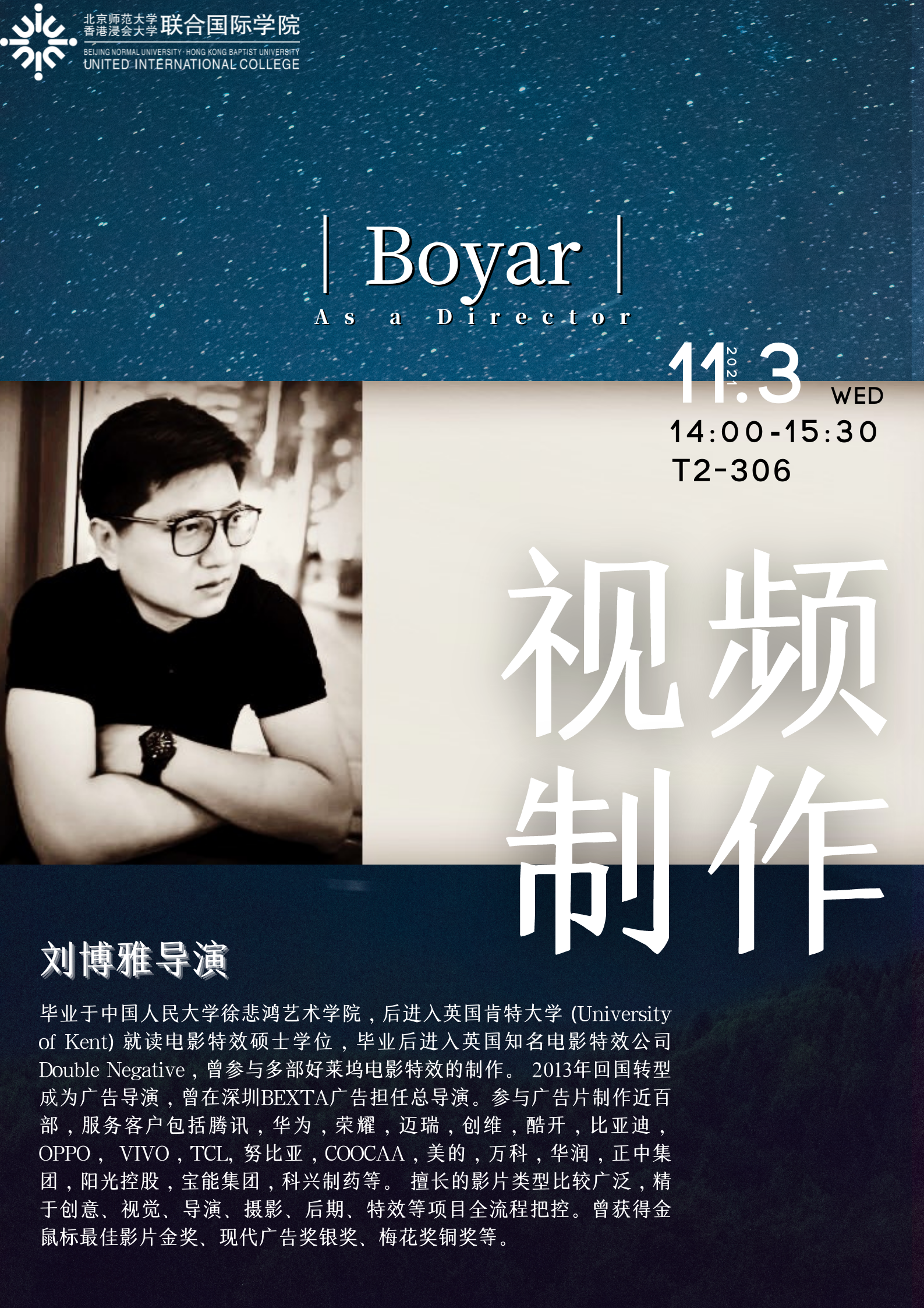 刘博雅导演简介:毕业于中国人民大学徐悲鸿艺术学院,后进入英国肯特大学 (University of Kent) 就读电影特效硕士学位,毕业后进入英国知名电影特效公司Double Negative,曾参与多部好莱坞电影特效的制作。 2013年回国转型成为广告导演,曾在深圳BEXTA广告担任总导演。参与广告片制作近百部,服务客户包括腾讯,华为,荣耀,迈瑞,创维,酷开,比亚迪,OPPO, VIVO,TCL, 努比亚,COOCAA,美的,万科,华润,正中集团,阳光控股,宝能集团,科兴制药等。 擅长的影片类型比较广泛,精于创意、视觉、导演、摄影、后期、特效等项目全流程把控。曾获得金鼠标最佳影片金奖、现代广告奖银奖、梅花奖铜奖等。