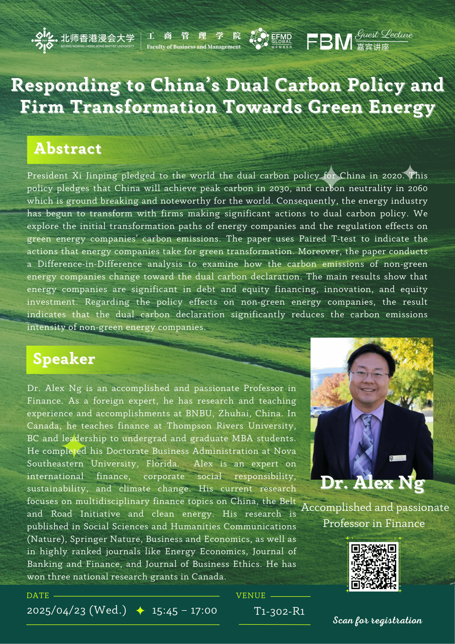 Alex Ng 博士是一位才华横溢、充满热情的金融学教授。 作为一名外国专家,他在中国珠海北京师范大学拥有研究和教学经验,并取得了丰硕的成果。在加拿大,他在不列颠哥伦比亚省汤普森河大学教授金融学,并为本科生和 MBA 研究生教授领导力课程。他在佛罗里达州诺瓦东南大学完成了工商管理博士学位。 亚历克斯是国际金融、企业社会责任、可持续发展和气候变化方面的专家。 他目前的研究重点是有关中国、“一带一路 ”倡议和清洁能源的多学科金融课题。 他的研究成果发表在《社会科学与人文通讯》(《自然》)、《施普林格-自然》、《商业与经济》以及《能源经济学》、《银行与金融杂志》和《商业伦理杂志》等高排名期刊上。他曾三次获得加拿大国家研究基金。