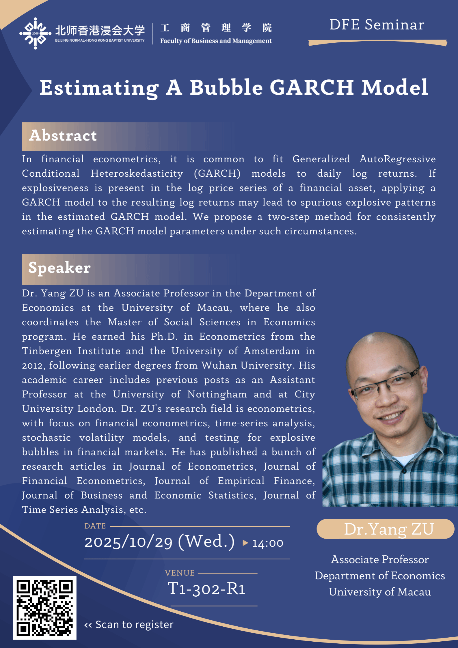 作者简介: 祖杨博士是澳门大学经济学系副教授,兼任经济学硕士课程主任。他于2012年获得阿姆斯特丹大学和丁伯根研究所的经济学博士学位,此前在武汉大学获得学士和硕士学位。其学术生涯包括曾担任伦敦城市大学及诺丁汉大学助理教授。祖博士的研究领域为计量经济学,重点关注金融计量经济学、时间序列分析、随机波动率模型及金融市场爆炸性泡沫检验。他已在《Journal of Econometrics》、《Journal of Financial Econometrics》、《Journal of Empirical Finance》、《Journal of Business and Economic Statistics》、《Journal of Time Series Analysis》等国际知名学术期刊发表多项研究成果。