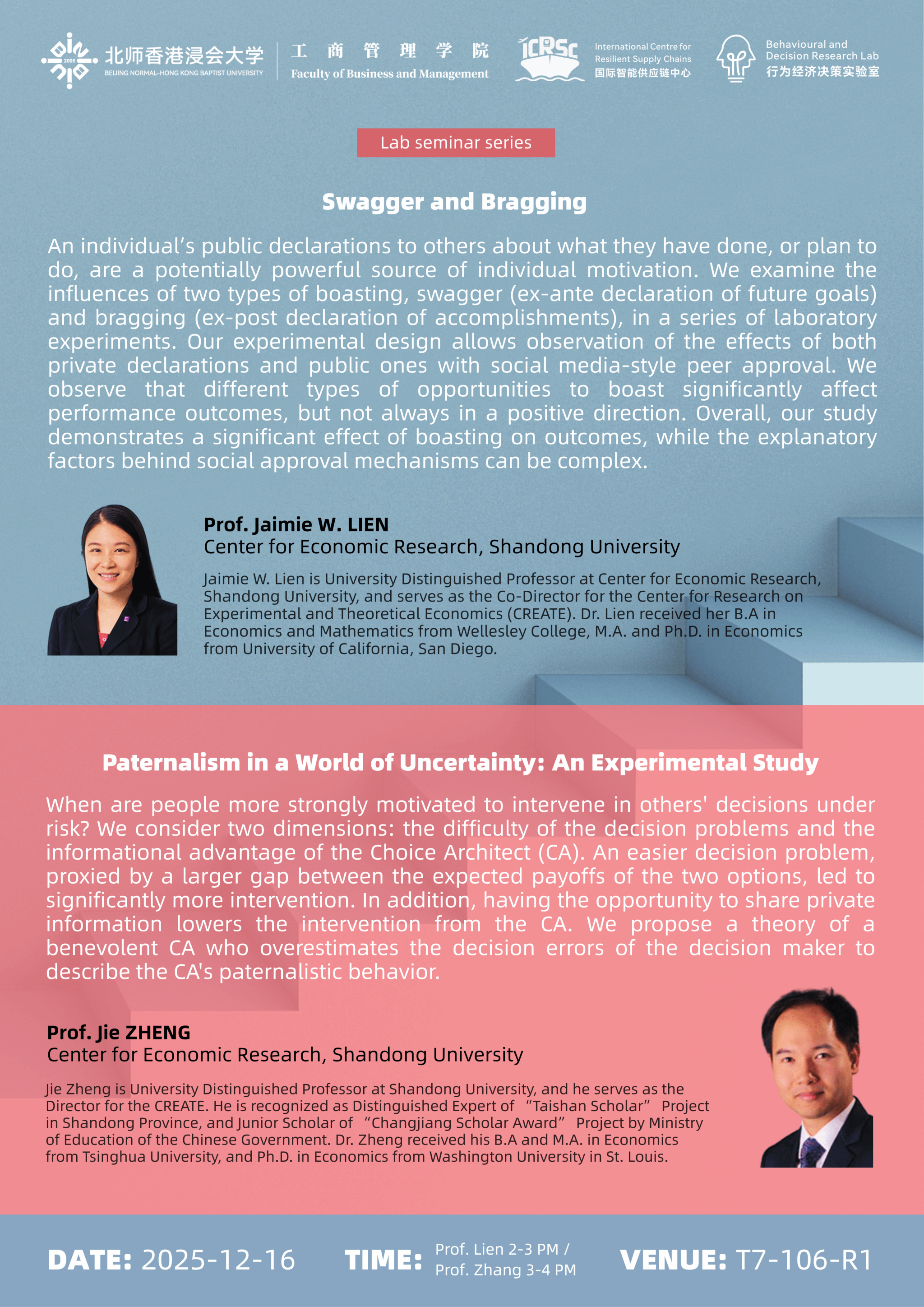 工商管理学院 “国际智能供应链中心” 与 “行为与决策研究实验室” 将于12月16日(周二)邀请两位山东大学知名学者分享最新研究成果。诚挚邀请您参加。