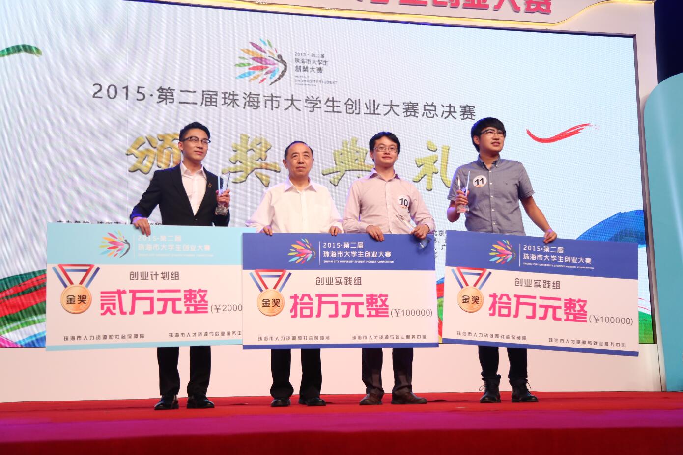 蜜蜂科技公司获第二届珠海大学生创业大赛创业实践组金奖,贾凡(右一)代表团队领奖