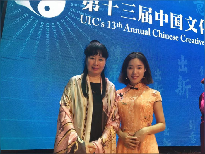 刘天彤在UIC第十三届中国文化创意大赛中与著名京剧表演艺术家孙萍老师合影