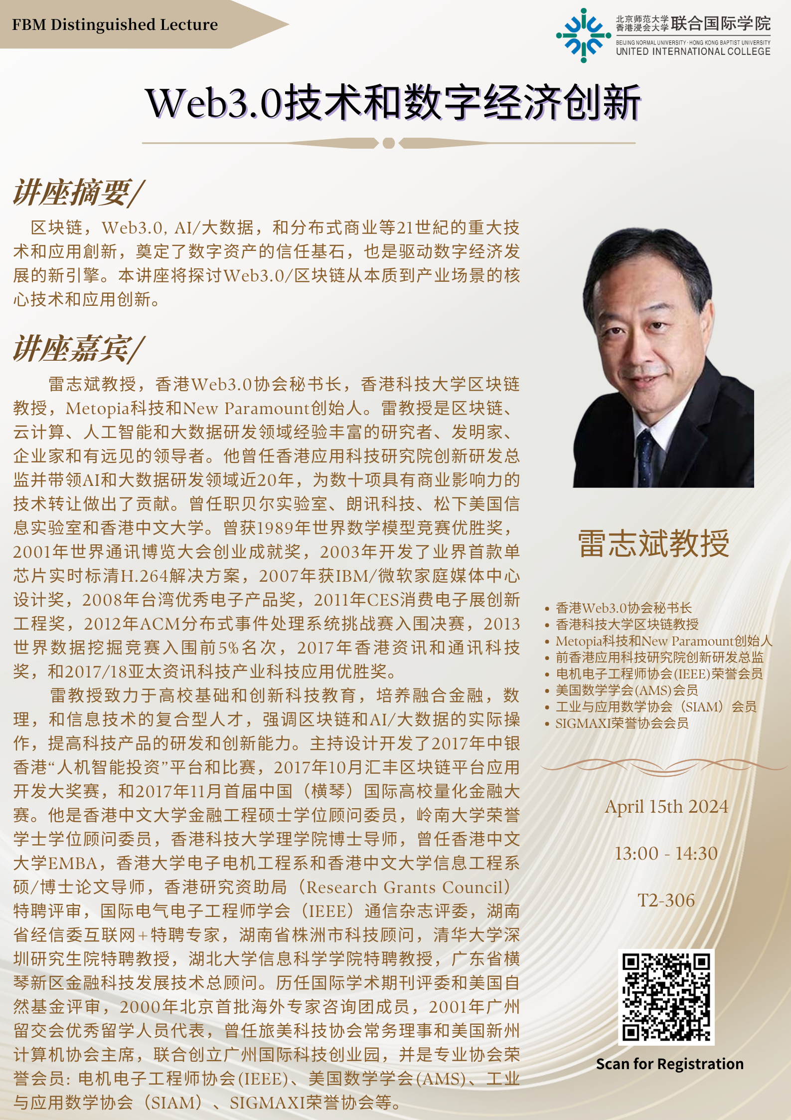 雷志斌教授,香港Web3.0协会秘书长,香港科技大学区块链教授,Metopia科技和New Paramount创始人。雷教授是区块链、云计算、人工智能和大数据研发领域经验丰富的研究者、发明家、企业家和有远见的领导者。他曾任香港应用科技研究院创新研发总监并带领AI和大数据研发领域近20年,为数十项具有商业影响力的技术转让做出了贡献。曾任职贝尔实验室、朗讯科技、松下美国信息实验室和香港中文大学。曾获1989年世界数学模型竞赛优胜奖,2001年世界通讯博览大会创业成就奖,2003年开发了业界首款单芯片实时标清H.264解决方案,2007年获IBM/微软家庭媒体中心设计奖,2008年台湾优秀电子产品奖,2011年CES消费电子展创新工程奖,2012年ACM分布式事件处理系统挑战赛入围决赛,2013世界数据挖掘竞赛入围前5%名次,2017年香港资讯和通讯科技奖,和2017/18亚太资讯科技产业科技应用优胜奖。