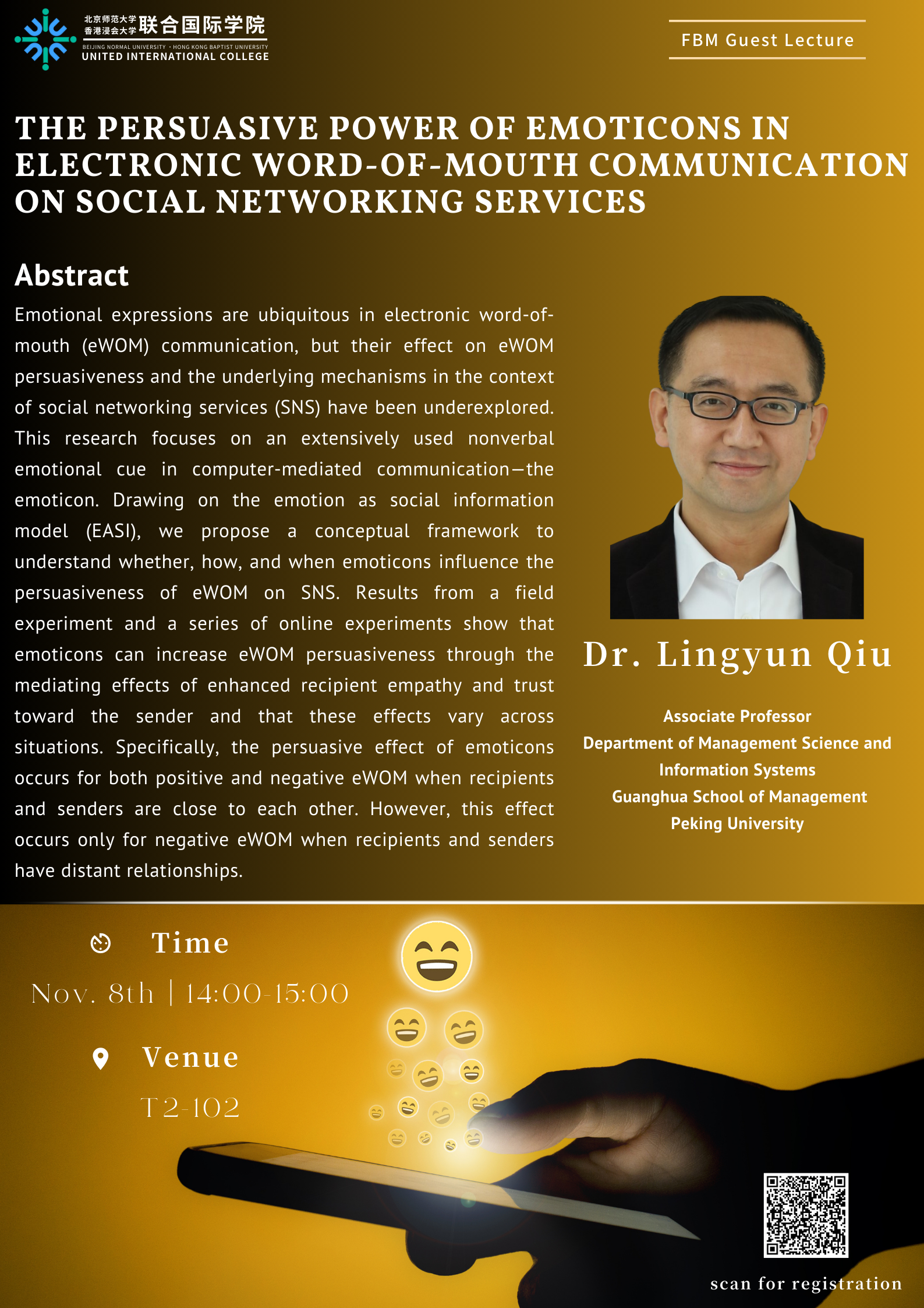 邱凌云博士,现任北京大学光华管理学院管理科学与信息系统系副教授。主讲“电子商务与数字化转型”、“互联网与商业模式创新”、“信息系统研究”等课程,研究领域为信息系统用户行为、电子商务与网络消费者行为、人机人智交互设计等。他曾在MISQ、JMIS、JAIS、DSS、I&M、IJEC、IJHCS、《清华大学学报》、《南开管理评论》、《营销科学学报》、《信息系统学报》等国内外知名学术期刊上发表多篇论文。现任北京大学光华管理学院创新创业中心副主任、中国系统工程学会信息系统工程专业委员会(CNAIS)副主任委员、中国信息经济学会理事。