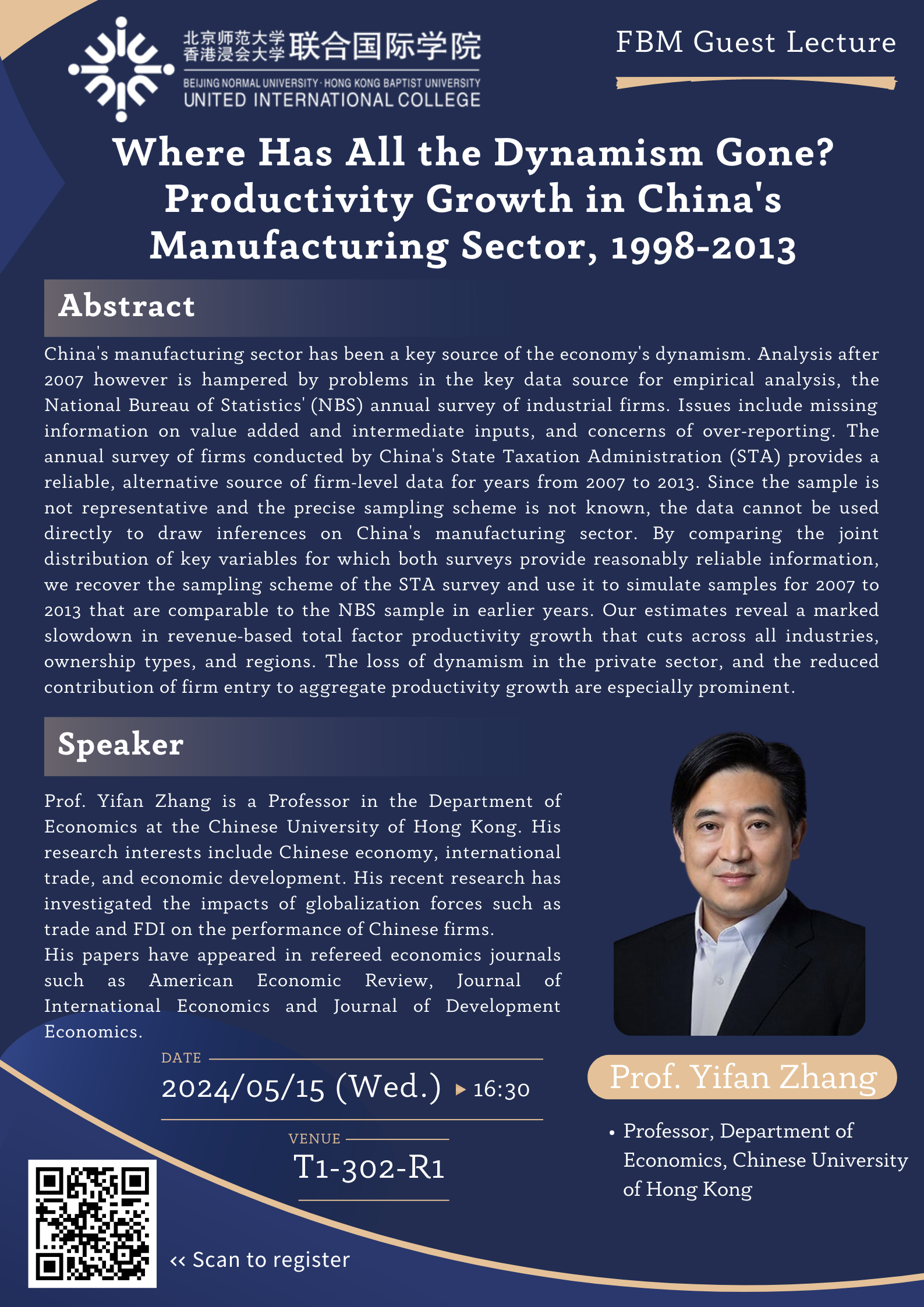 Yifan Zhang is a Professor in the Department of Economics at the Chinese University of Hong Kong. He received B.A. and M.A. from Renmin University of China and Ph.D. from University of Pittsburgh. His research interests include Chinese economy, international trade, and economic development. His papers have appeared in refereed economics journals such as American Economic Review, Journal of International Economics and Journal of Development Economics. He has been a consultant for the World Bank and the Asian Development Bank. His recent research has investigated the impacts of globalization forces such as trade and FDI on the performance of Chinese firms.