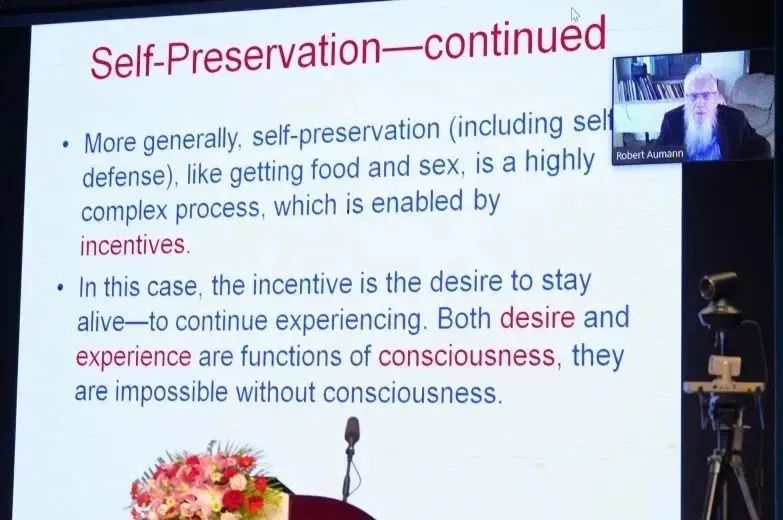 Robert John Aumann院士以“人工智能与自然智能”为题发表演讲。谈及自然智能(NI)与人工智能(AI)的区别,他认为自然智能对情感的重要运用是人工智能无法做到的。在AI系统中,系统的目的和它所要实现的目标是从外部施加在系统上的。而在NI系统中,系统的目的是系统的一部分。他认为这种区别可以用来解释人类意识进化的起源。Aumann院士表示,自己很荣幸成为UIC的荣誉教授,并以中文表示感谢。