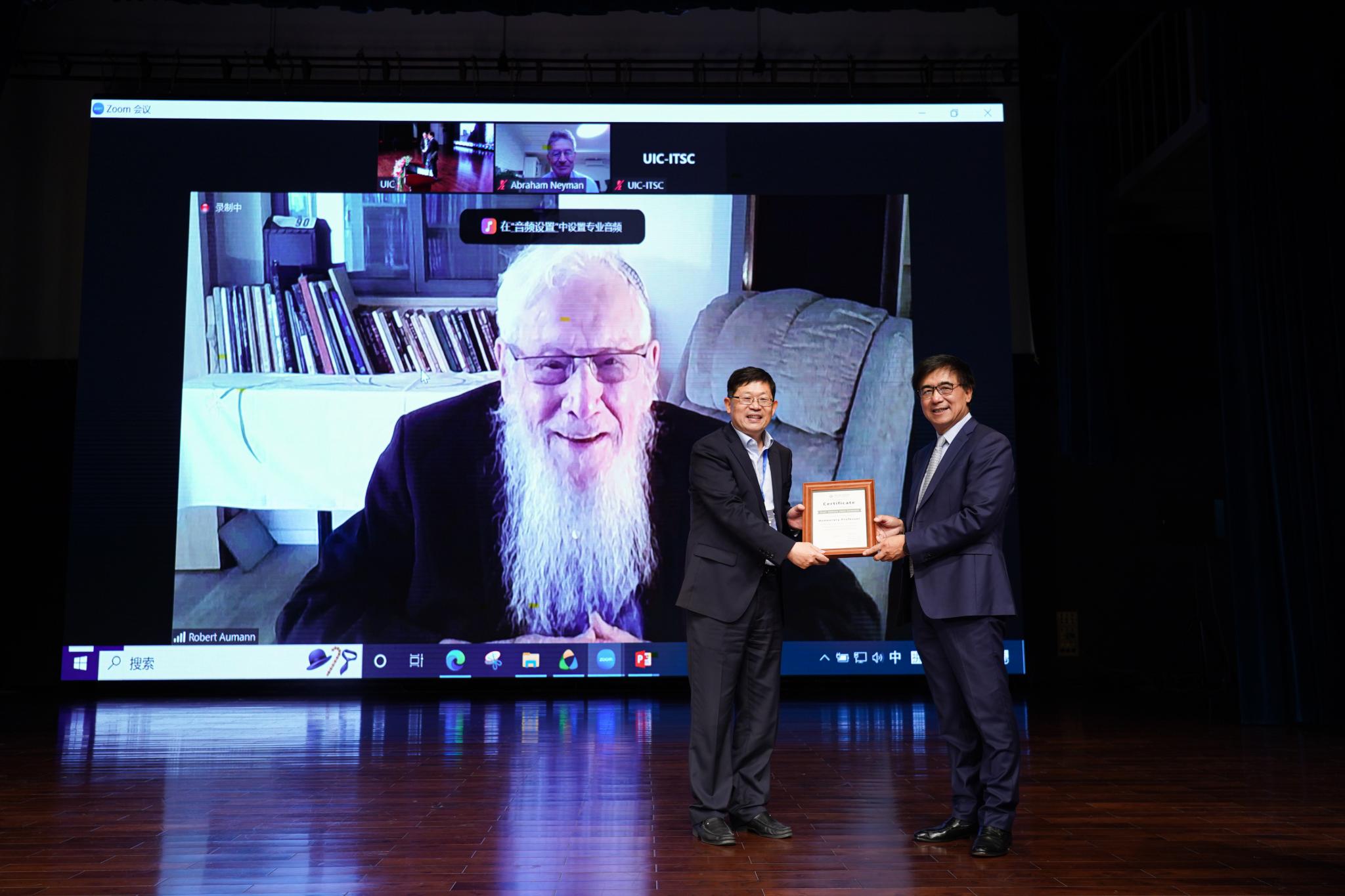 中国科学院院士、UIC校长汤涛教授(右)为诺贝尔奖得主Robert John Aumann颁授UIC荣誉教授证书,刘文斌教授(左)代领