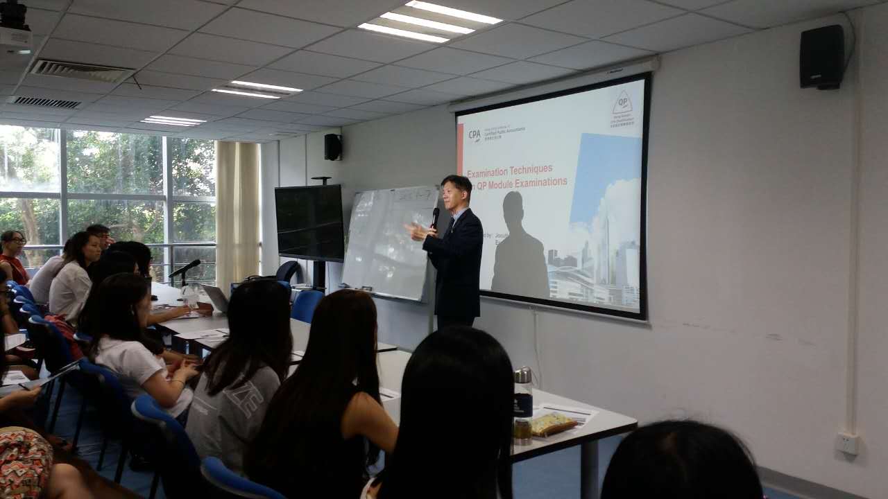Mr. Jonathan Ng, Executive Director of Hong Kong Institute of Certified Public Accountants (HKICPA), delivered a professional talk on 14th September on campus. The topic of the talk was “Examination Techniques on QP Module Examinations”. Mr. Ng introduced the HKICPA Qualification Programme, QP workshops and shared with DBM students the examination techniques and major causes to examination failure to help the candidates better prepare the exams.
