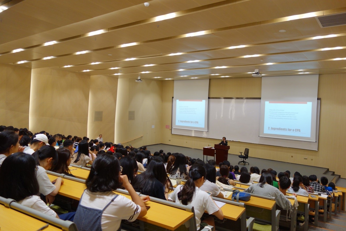 Prof Stella Cho, Dean of the Division and Business and Management (DBM), Mr Joseph Liang, PD of Accounting, and Ms Francee Guan, Associate Manager of Education and Training in Hong Kong Institute of Certified Public Accountants (HKICPA), delivered a professional talk to year 1 students on 10 September on campus.