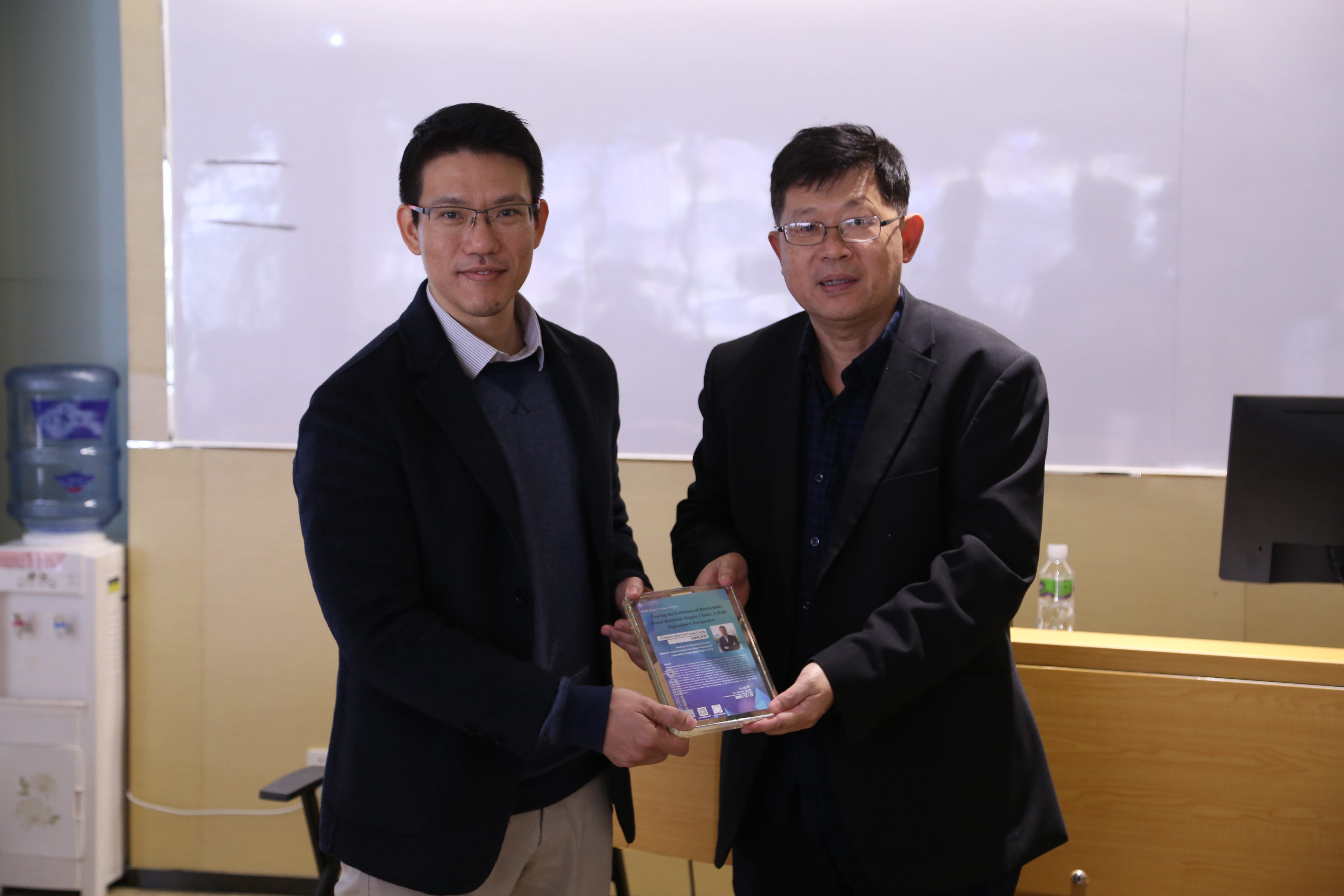 Prof. Wenbin Liu (right) presents a souvenir to Prof. Alian Chong