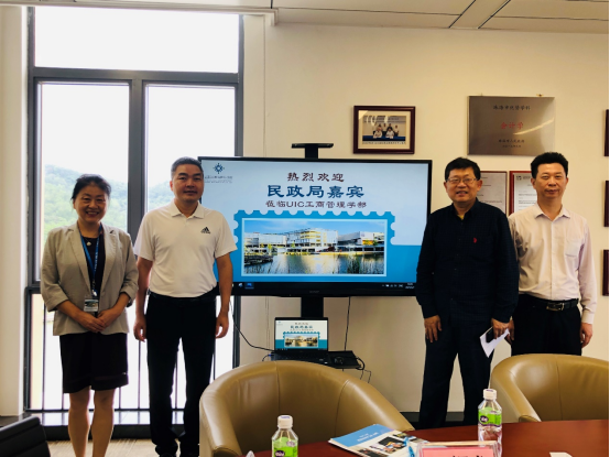 From Left to Right: Ms. Hong Wang (UIC Deputy Secretary for the Party), Mr. Hai Yang (Deputy Head of Zhuhai Civil Affairs Bureau), Prof. Wenbin Liu (Dean of Division of Business and Management at UIC), Mr. Wenyong Lin (Section Chief at Zhuhai Civil Affairs Bureau)