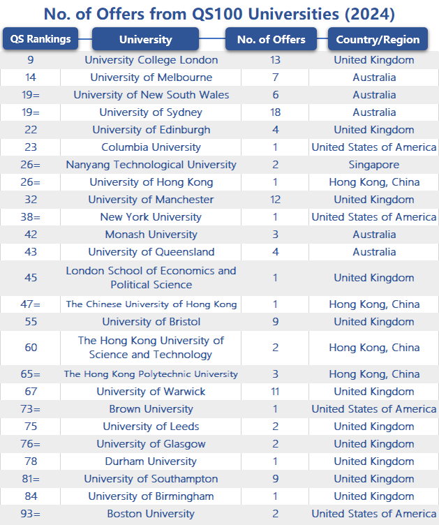 The graduates pursuing advanced studies received a total of 117 postgraduate admission offers from world-renowned institutions, averaging 3.7 offers from QS Top 100 universities per person, reflecting the breadth and quality of their options.
