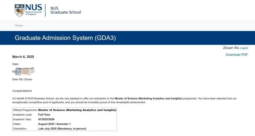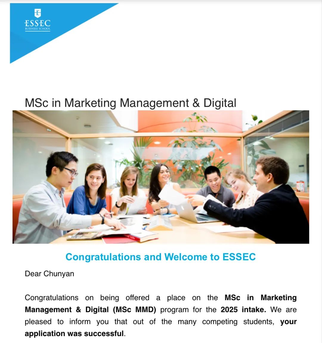 2025届市场营销管理毕业生今年共斩获7份新加坡国立大学offer!其中4份集中在 “市场营销分析与洞察”硕士项目,程一航/何青妍/柯春妍/吴梓瑄组团出发。这不仅体现了同学们在营销领域纵深发展的强烈意愿,更是世界顶尖学府对本专业学子实力的高度认可!