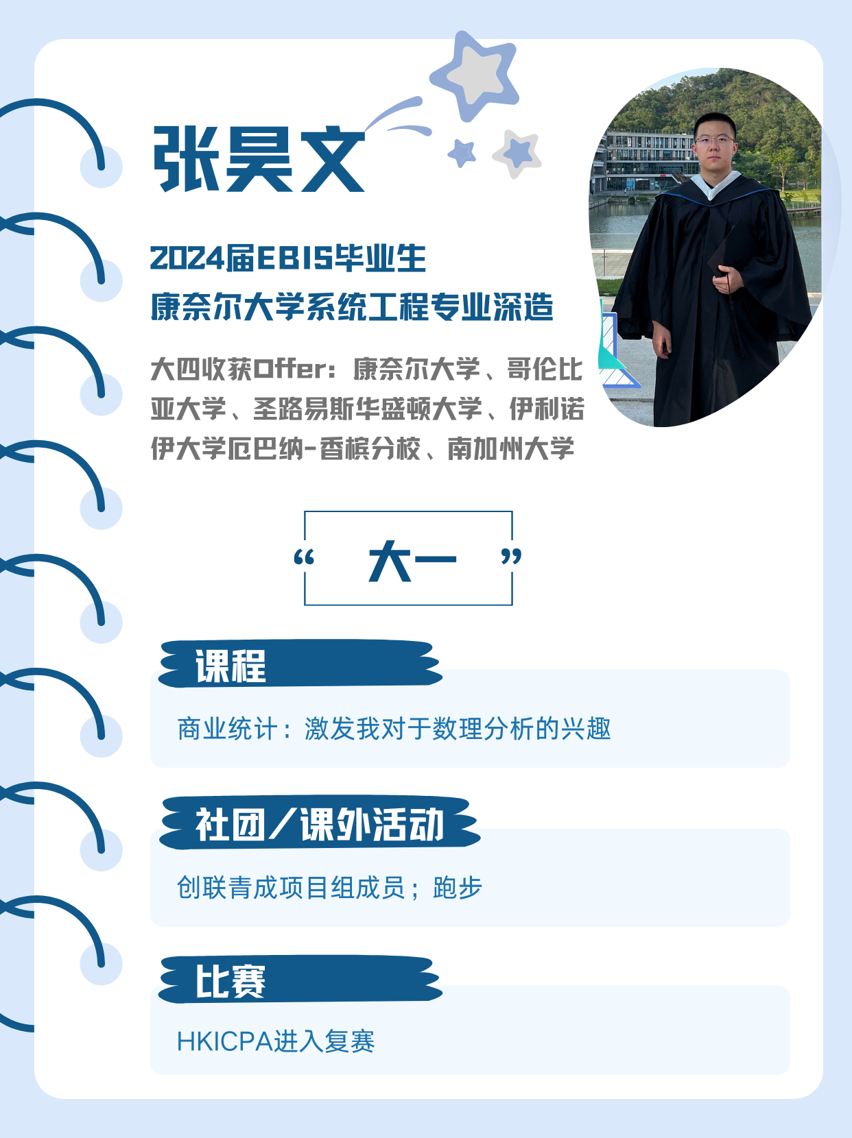 读研:张昊文,2024届电子商务与资讯系统管理(EBIS)毕业生,康奈尔大学(QS 13)系统工程专业深造