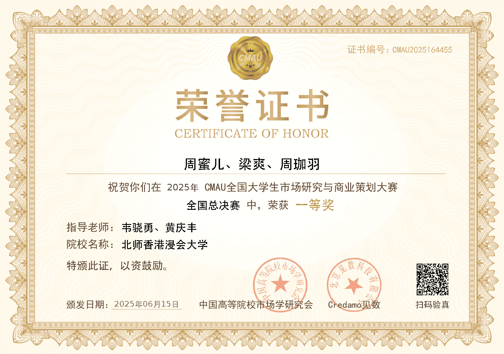 2025年6月15日,由中国高等院校市场学研究会与Credamo见数联合主办,西安交通大学承办的第四届CMAU全国大学生市场研究与商业策划大赛(以下简称“CMAU市策大赛”)全国总决赛顺利闭幕。本届大赛共有来自全国31个省、自治区、直辖市的32742人报名参赛,参赛院校508所,校赛阶段共有2881支团队成功提交参赛作品,最终推送108支团队晋级全国总决赛。我校共有28支团队报名参赛。经过校内赛、南部赛区决赛、全国总决赛,来自工商管理学院的GPS团队在全国近3000支队伍中突出重围,斩获全国总决赛一等奖。我校被授予“最佳组织奖”,工商管理学院管理系主任黄庆丰及数字媒体管理专业主任韦骁勇获得“优秀指导教师奖”。