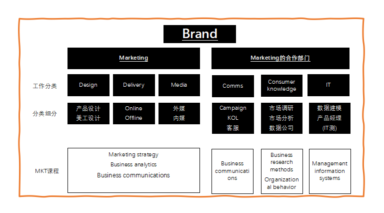 MKT是品牌最直接的部门,包括设计、渠道和最核心的媒体。还有与MKT合作的部门,例如公关营销、调研分析以及IT (如下图)。